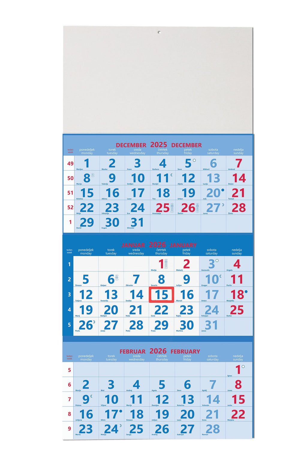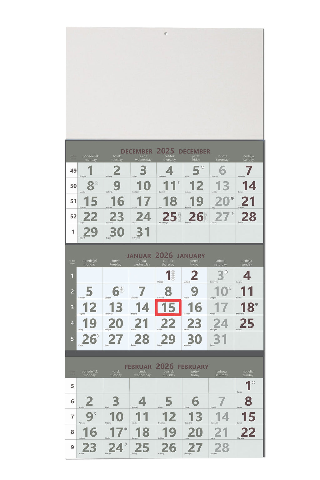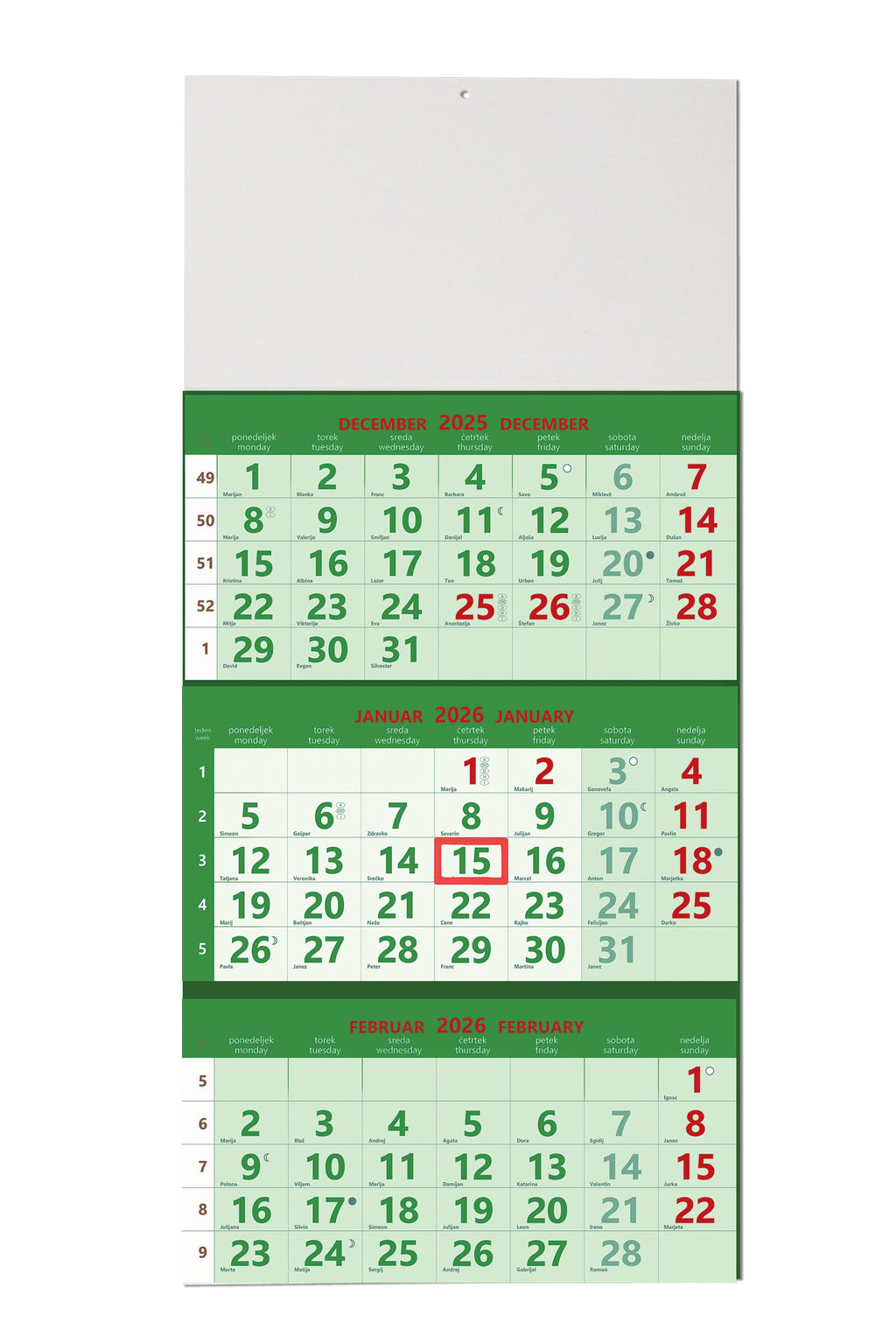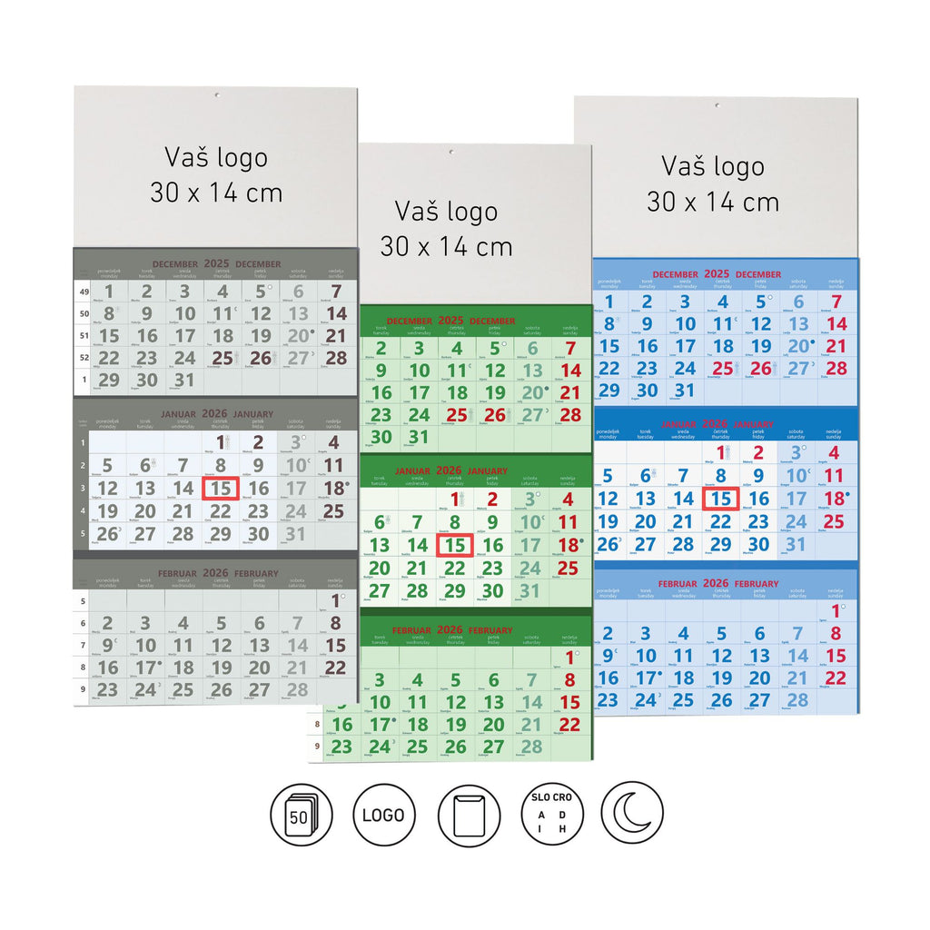 Lepljen, perforiran, vložen v vrečko, označeni prazniki držav SLO, A, I, CRO, H, D, lunine mene, mogoč natis logotipa na pasico 30 x 14 cm, PVC zatič.