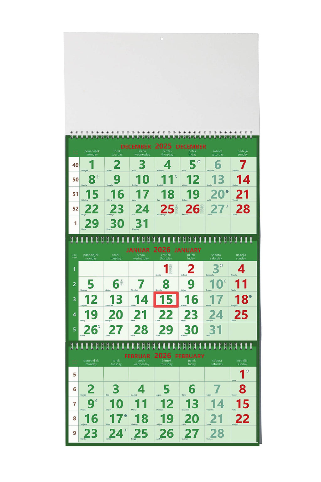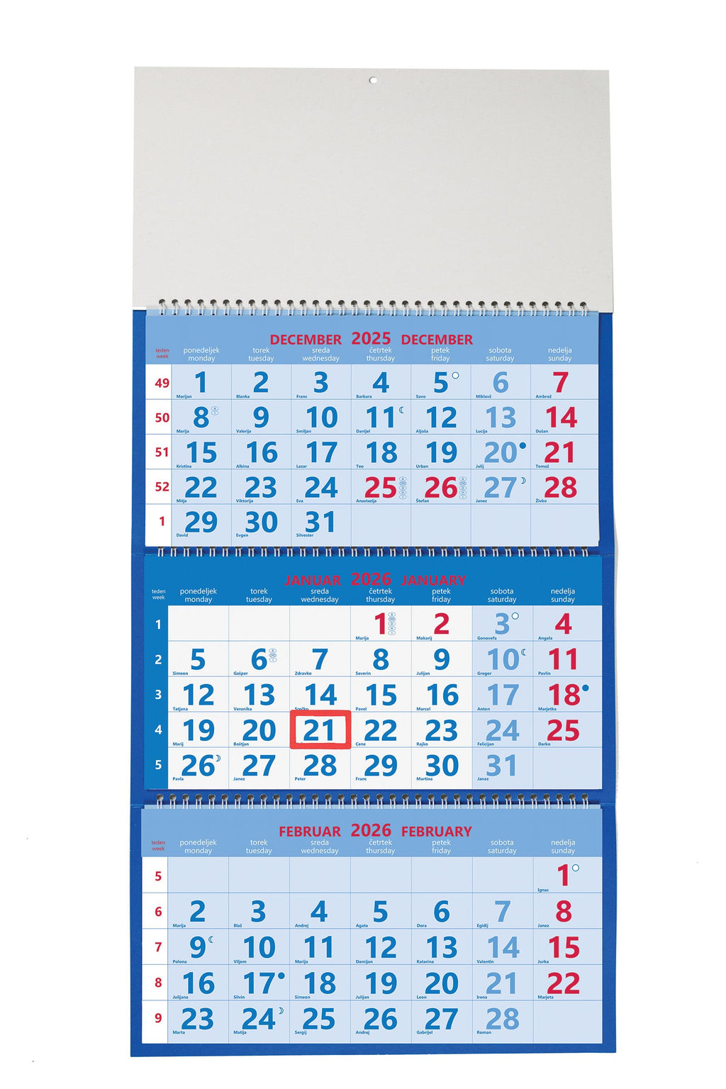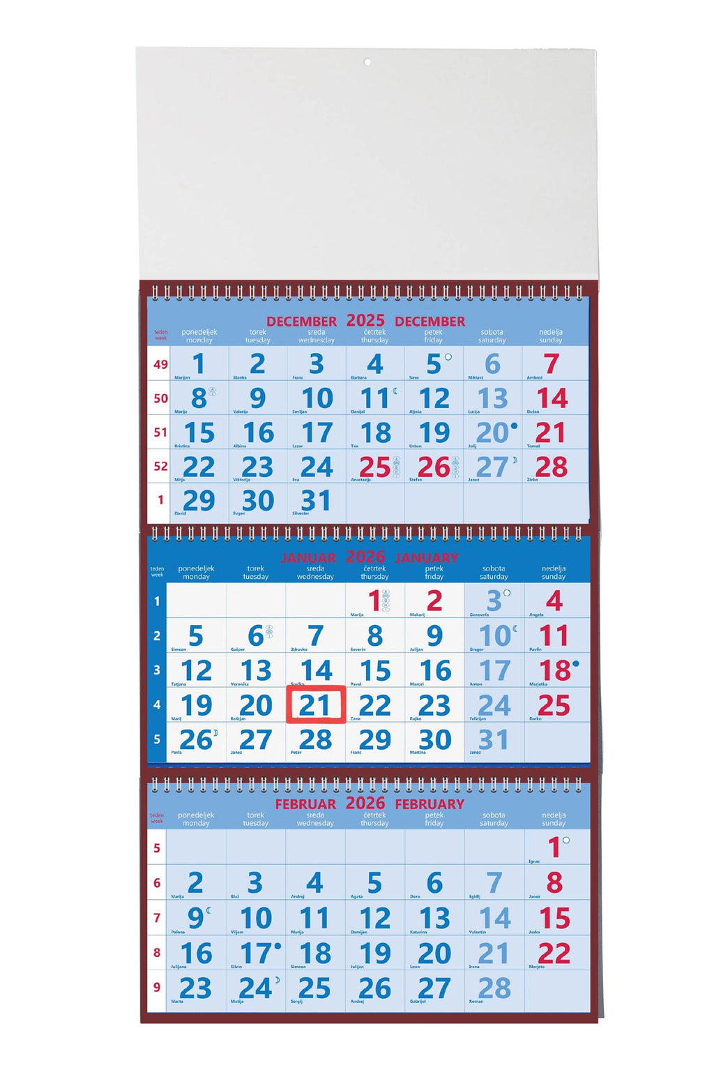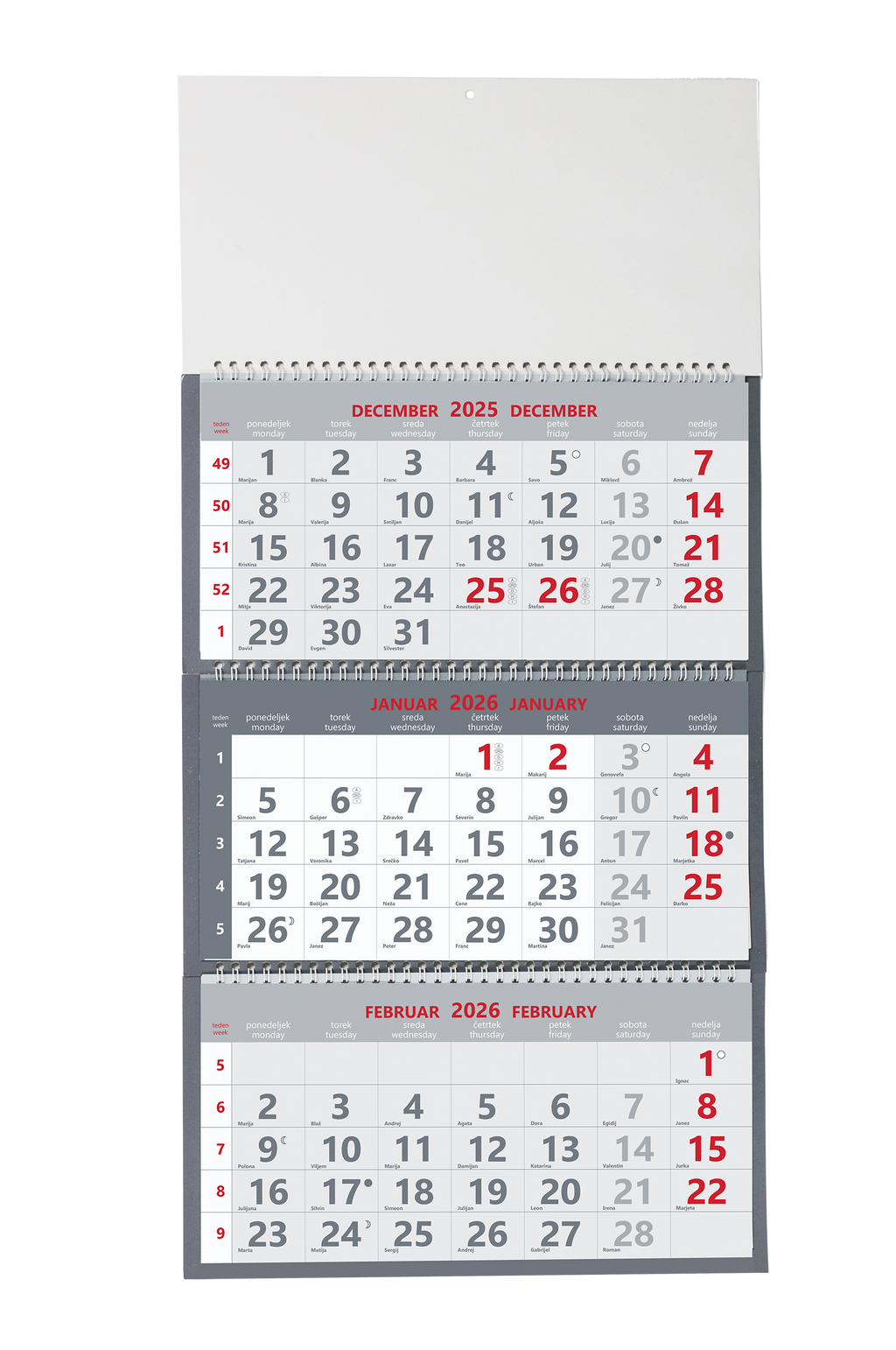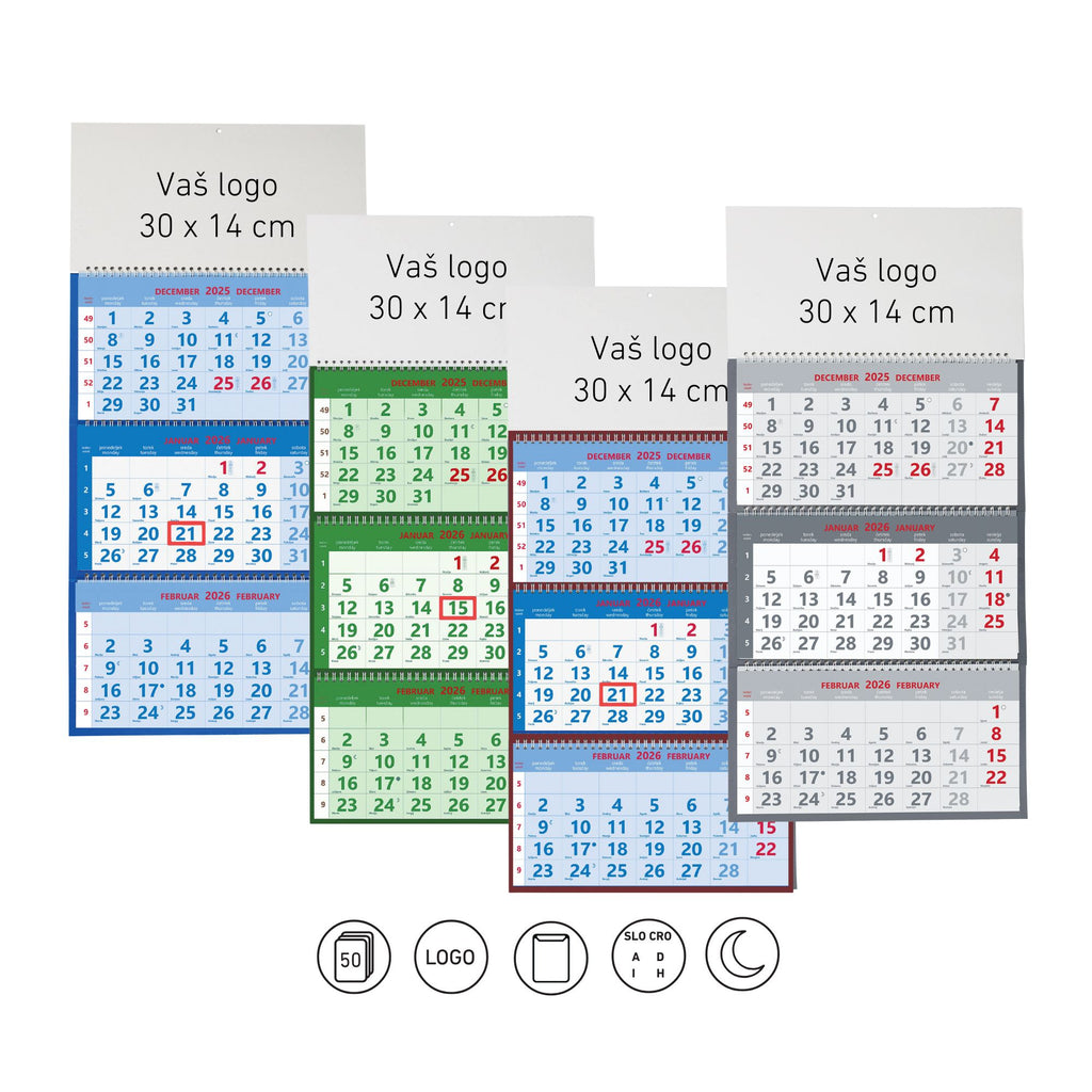 Spiralna vezava, vložen v vrečko, označeni prazniki držav SLO, A, I, CRO, H, D, lunine mene, mogoč natis logotipa na pasico 30 x 14 cm, PVC zatič.