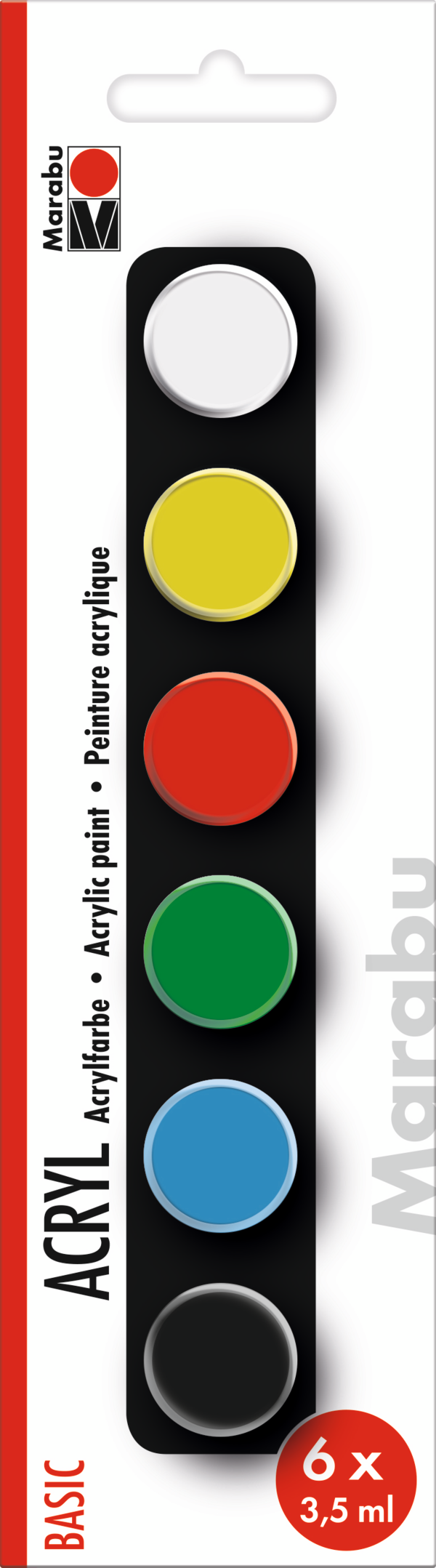 Vsebina seta Basic: 6 x 3,5 ml visoko prekrivnih akrilnih barv (limonino rumena, škrlatna, temno cijan, listnato zelena, titanovo bela, črna).