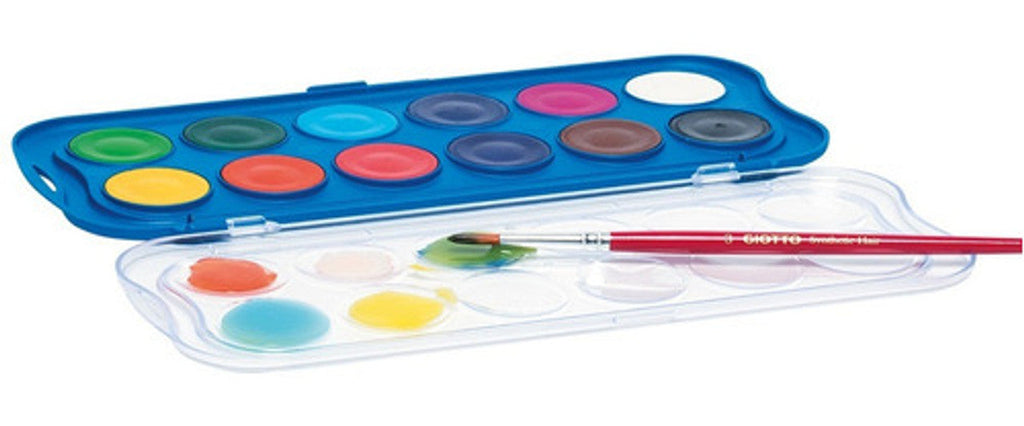 Vodenke Giotto so primerne za ustvarjanje doma in v šoli. Kvalitetne vodene barvice s premerom 30 mm imajo novo obliko za preprečevanje razlivanja vode. Pokrov pakiranja služi kot paleta, praktična zasnova pa preprečuje razlivanje vode med barvami. Paket vsebuje tudi kakovosten čopič s sintetičnimi ščetinami. V pakiranju je 12 različnih barv.