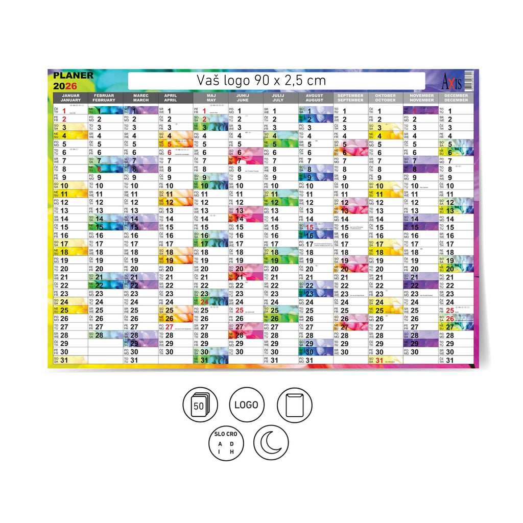 Enoletni stenski listni koledar, označeni prazniki držav SLO, A, I, CRO, H, D, s prostorom za beležke, mogoč natis logotipa na pasico 90 x 2,5 cm.