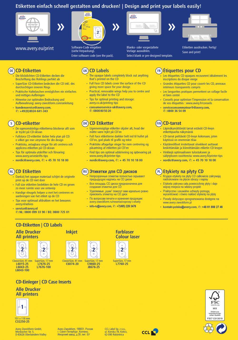 V zavitku je 100 listov, vseh etiket je 200. Nalepke SuperSize prekrijejo celotno površino CD-ja, praktični jezički pa pomagajo pri namestitvi na CD. Imajo permanentno lepilo in dober oprijem. Primerne so za tiskanje z vsemi standardnimi tiskalniki. Imajo FSC® certifikat - izvor lesa je iz zanesljivih virov. Za oblikovanje uporabite brezplačni program, dostopen je na www.avery-zweckform.si.