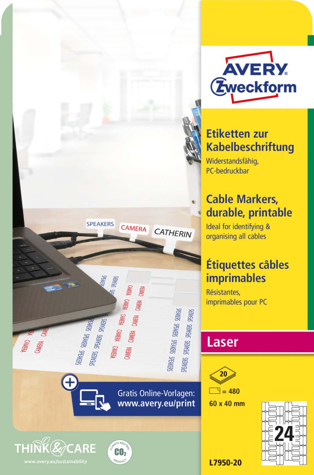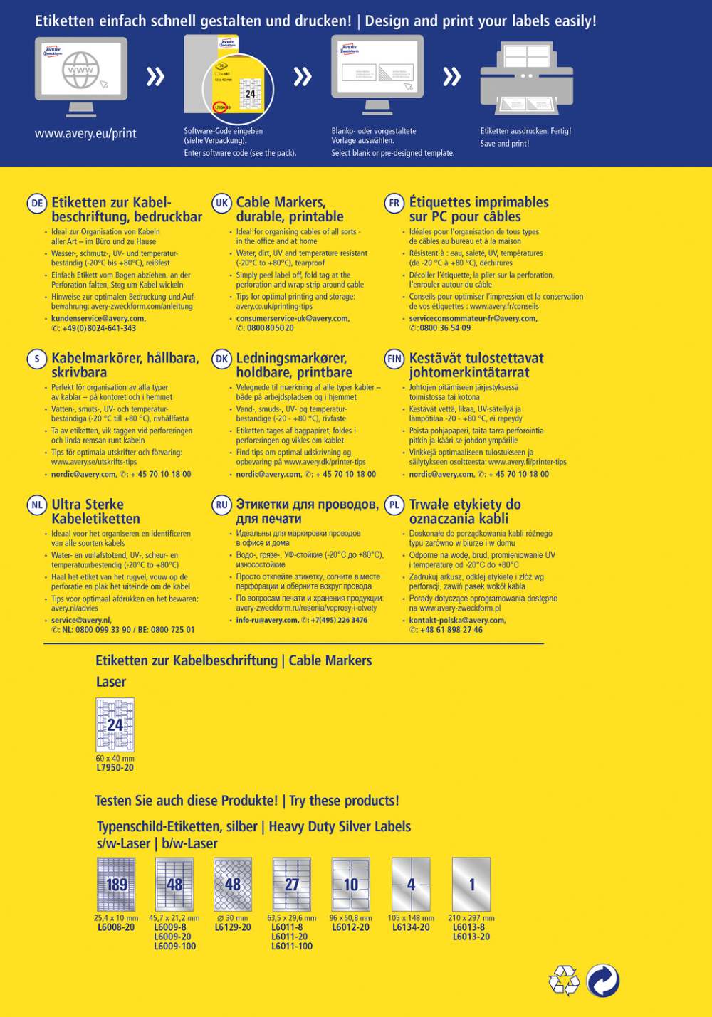 V zavitku je 20 listov, vseh etiket je 480. Nalepke imajo permanentno lepilo in zanesljiv oprijem na različnih podlagah. Primerne so za tiskanje z laserskimi tiskalniki. Se ne trgajo in so odporne na olje, umazanijo, UV žarke, temperaturo in vodo. Idealne so za trajno označevanje. Etikete ne vsebujejo PVC in so proizvedene podnebno nevtralno. Za oblikovanje uporabite brezplačni program, dostopen je na www.avery-zweckform.si.