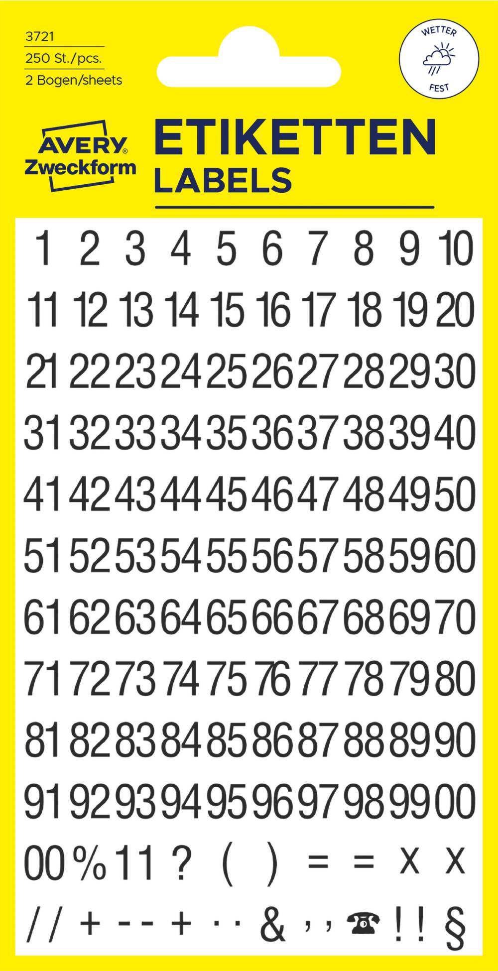 V zavitku sta 2 listka, vseh etiket je 250. Nalepke imajo močno lepilo in odporne so na vodo. Narejene so iz folije, ki ne vsebuje PVC. Izdelano v Nemčiji.