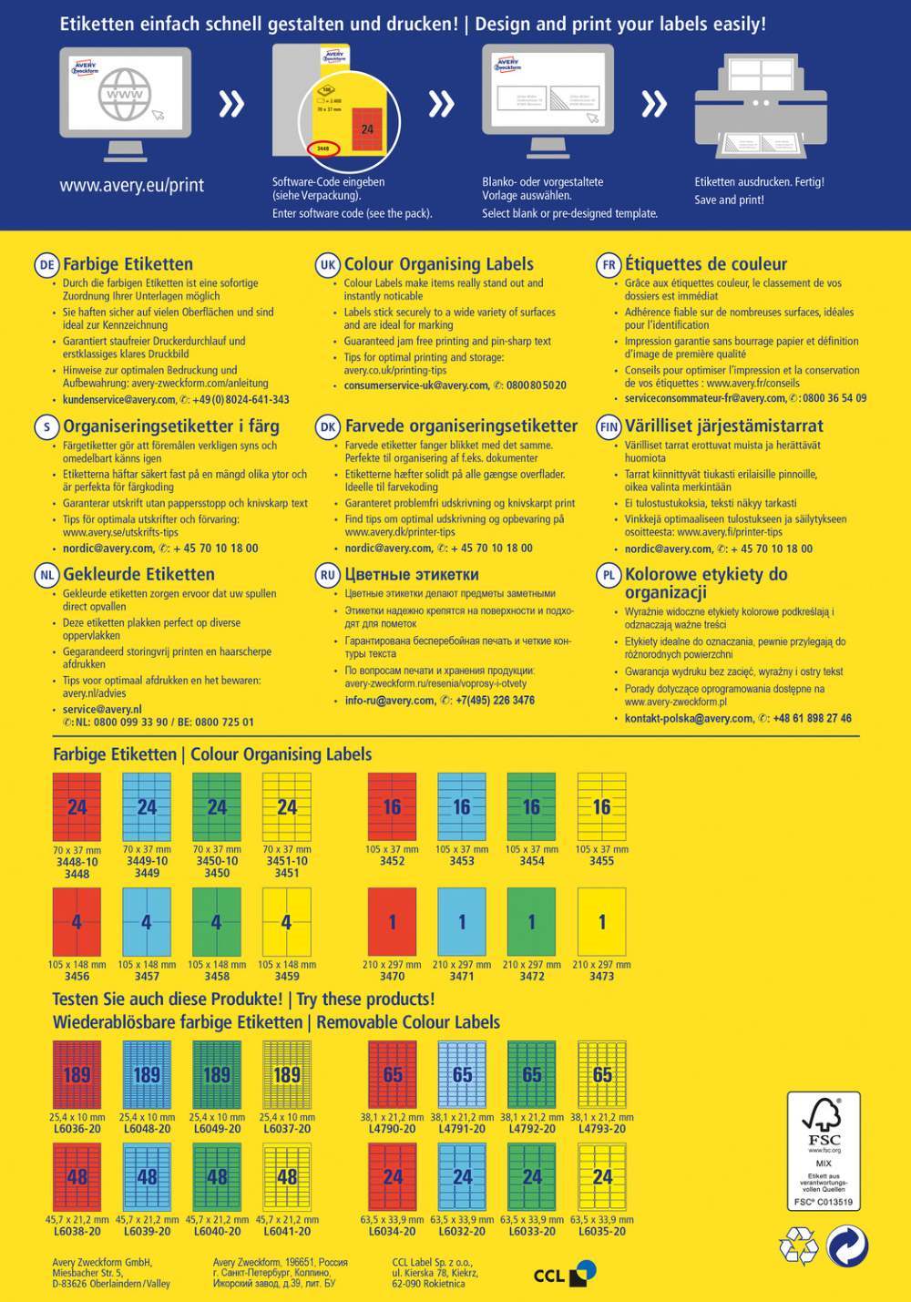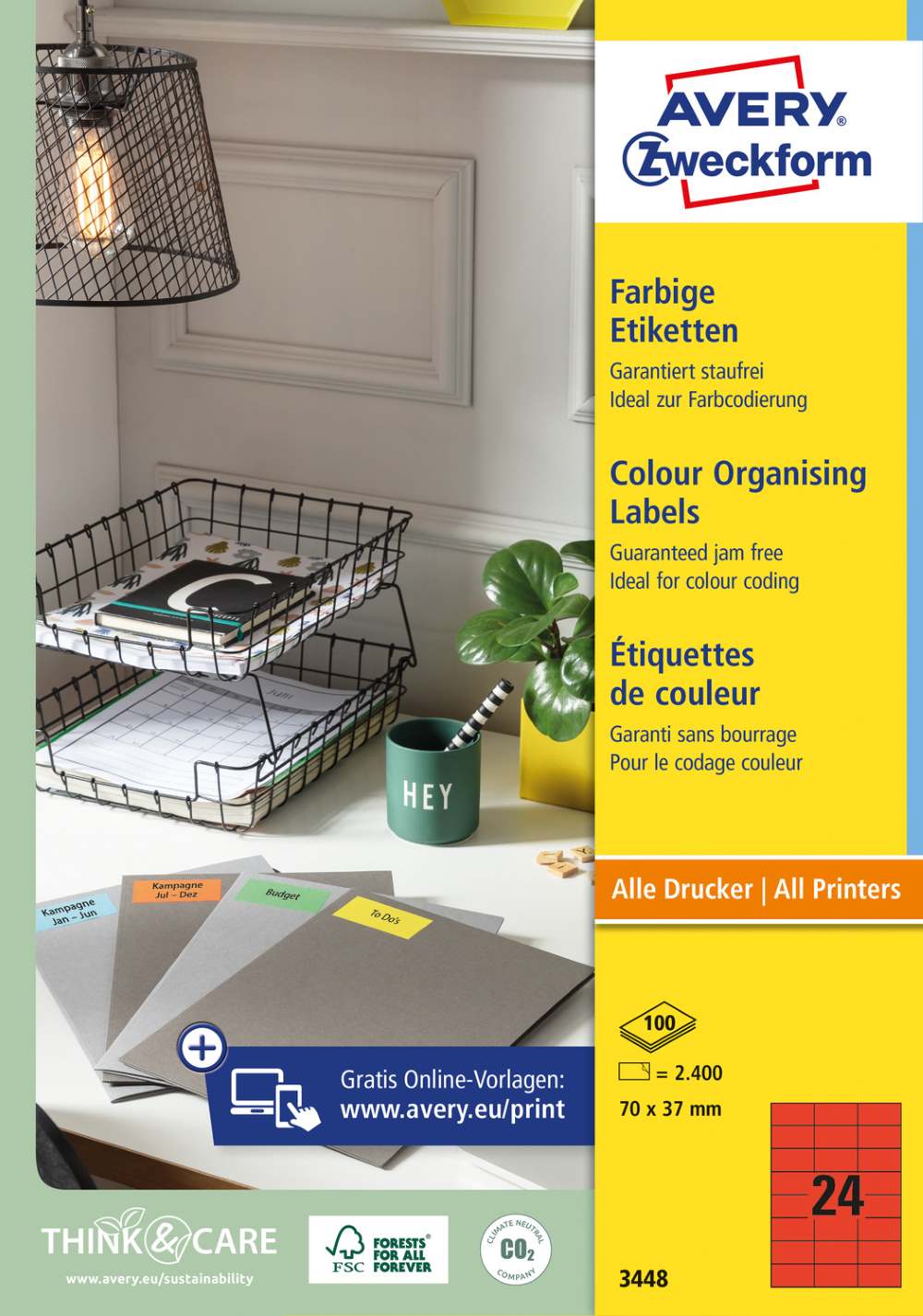 V zavitku je 100 listov, vseh etiket je 2400. Nalepke imajo permanentno lepilo in zanesljiv oprijem na različnih podlagah. Primerne so za tiskanje z vsemi standardnimi tiskalniki. Vrhunska oprijemljivost tonerja ali črnila zagotavlja, da se tisk ne packa. Imajo FSC® certifikat - izvor lesa je iz zanesljivih virov. Za oblikovanje uporabite brezplačni program, dostopen je na www.avery-zweckform.si. Na voljo v različnih barvah.