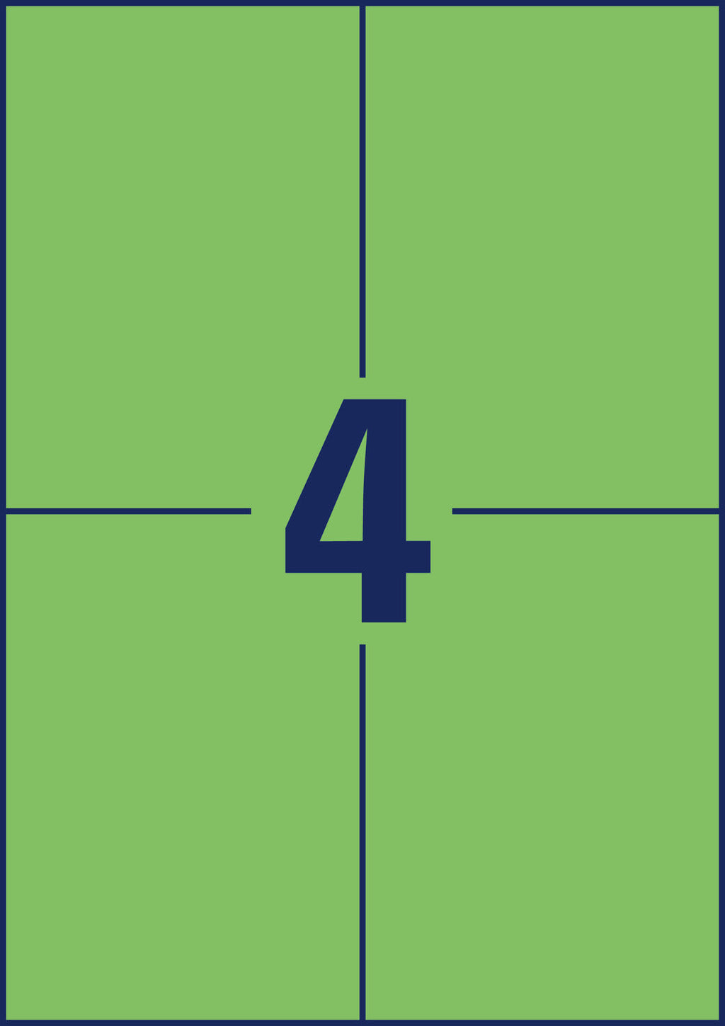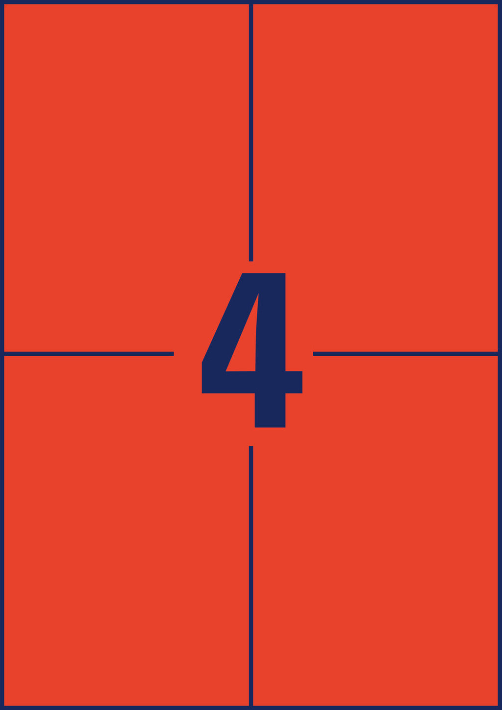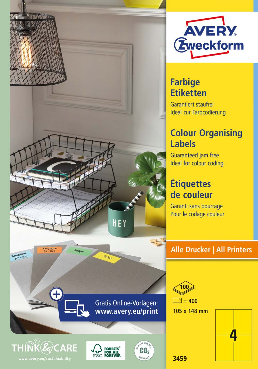V zavitku je 100 listov, vseh etiket je 400. Vse etikete so enake barve. Nalepke imajo permanentno lepilo in zanesljiv oprijem na različnih podlagah. Primerne so za tiskanje z vsemi standardnimi tiskalniki. Vrhunska oprijemljivost tonerja ali črnila zagotavlja, da se tisk ne packa. Imajo FSC® certifikat - izvor lesa je iz zanesljivih virov. Za oblikovanje uporabite brezplačni program, dostopen je na www.avery-zweckform.si.