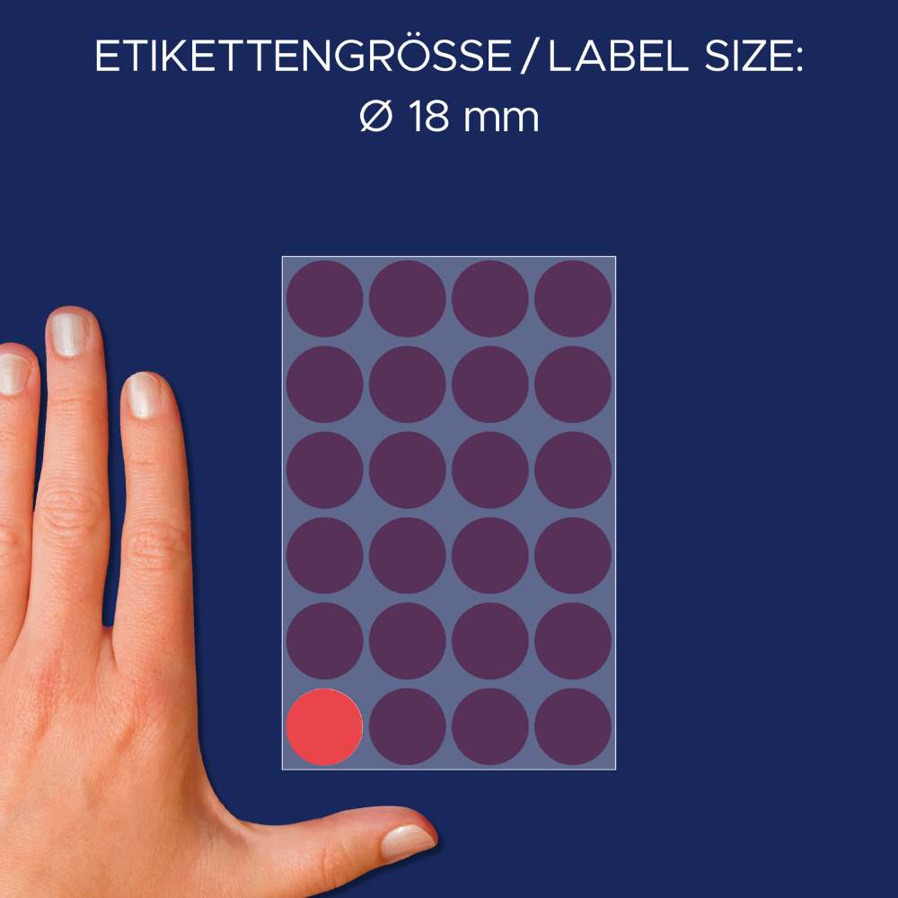 Nalepke imajo permanentno lepilo in so idealne za označevanje, organiziranje, razporejanje in načrtovanje. Beljene so brez klora in so 100 % izdelane iz papirja s certifikatom FSC® - izvor lesa je iz preverjenih in zanesljivih virov. Niso primerne za tiskanje. V zavitku so 4 listi. Na voljo v dveh premerih: večje, premera 18 mm (v pakiranju je 96 etiket) in manjše, premera 8 mm (v pakiranju je 416 etiket).