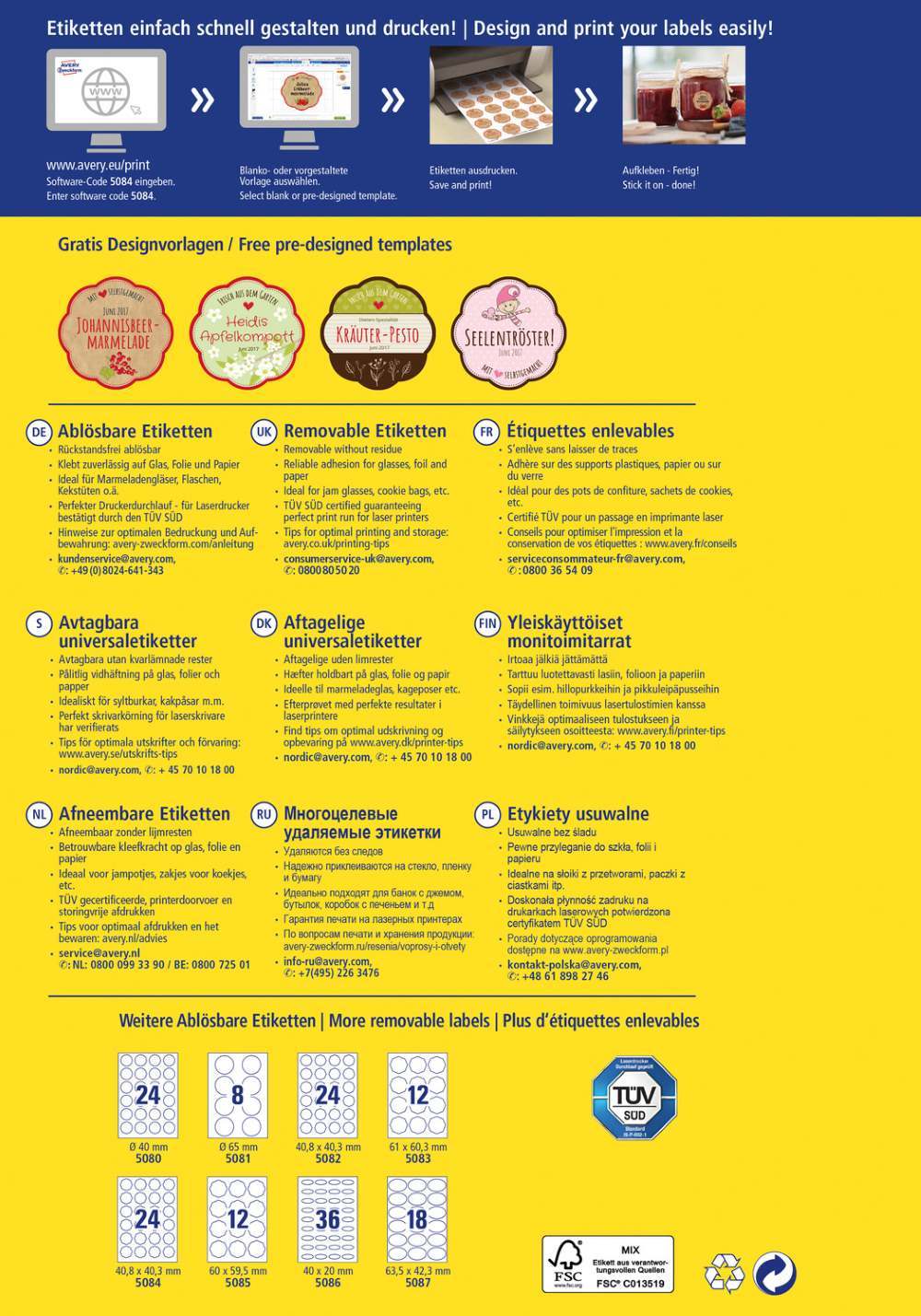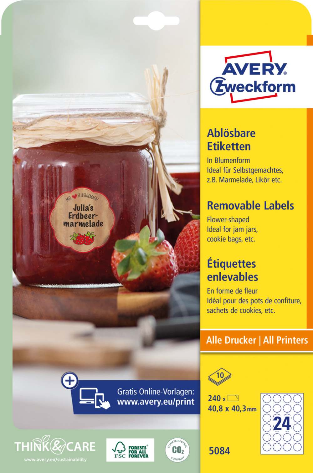 V zavitku je 10 listov, vseh etiket je 240. Nalepke imajo odstranljivo lepilo in zanesljiv oprijem na različnih podlagah. Primerne so za tiskanje z vsemi standardnimi tiskalniki. Idealne so za začasno označevanje. Etikete imajo FSC® certifikat - izvor lesa je iz preverjenih in zanesljivih virov. Za oblikovanje uporabite brezplačni program, dostopen je na www.avery-zweckform.si.
