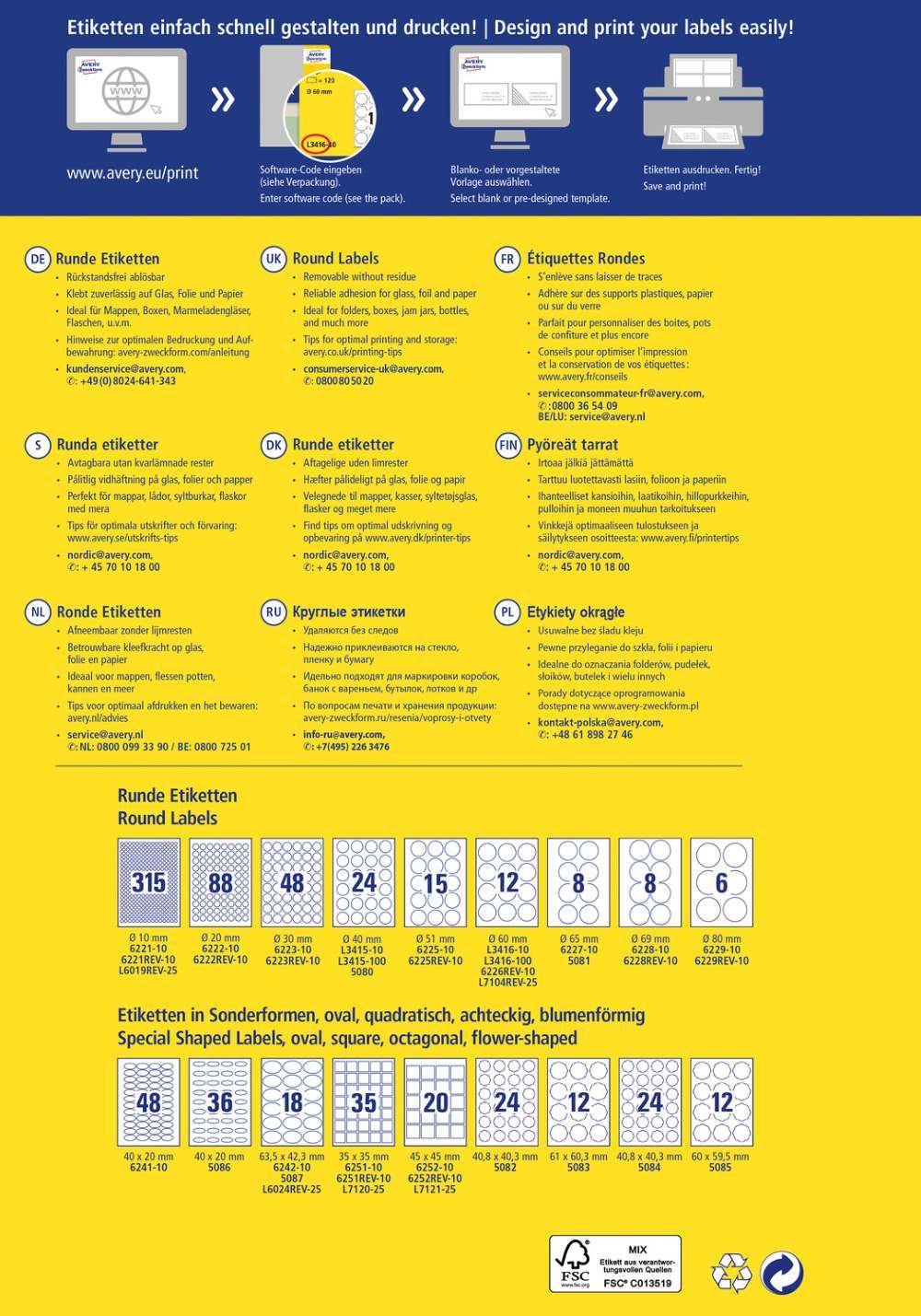 V zavitku je 25 listov, vseh etiket je 300. Nalepke imajo odstranljivo lepilo in zanesljiv oprijem na različnih podlagah. Primerne so za tiskanje z vsemi standardnimi tiskalniki. Idealne so za začasno označevanje. Etikete imajo FSC® certifikat - izvor lesa je iz preverjenih in zanesljivih virov. Za oblikovanje uporabite brezplačni program, dostopen je na www.avery-zweckform.si.