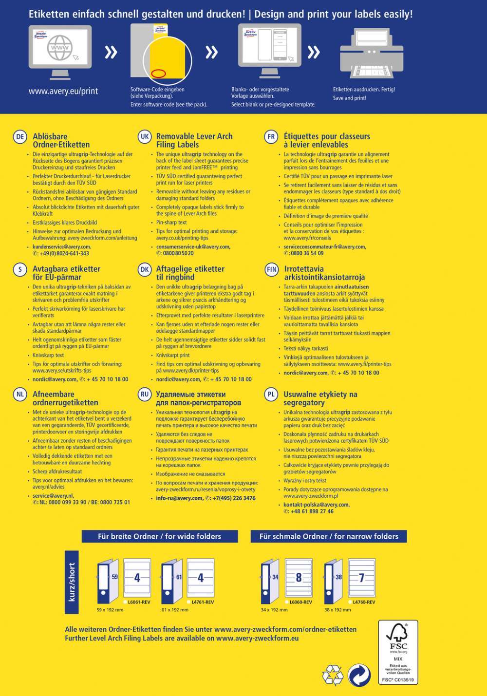 V zavitku je 10 listov, vseh etiket je 70. Nalepke imajo permanentno lepilo in so neprosojne, popolnoma prekrijejo stari tekst. Primerne so za tiskanje z vsemi standardnimi tiskalniki. Ultragrip tehnologija zagotavlja tiskanje brez zastoja. Imajo FSC® certifikat - izvor lesa je iz zanesljivih virov. Za oblikovanje uporabite brezplačni program, dostopen je na www.avery-zweckform.si.
