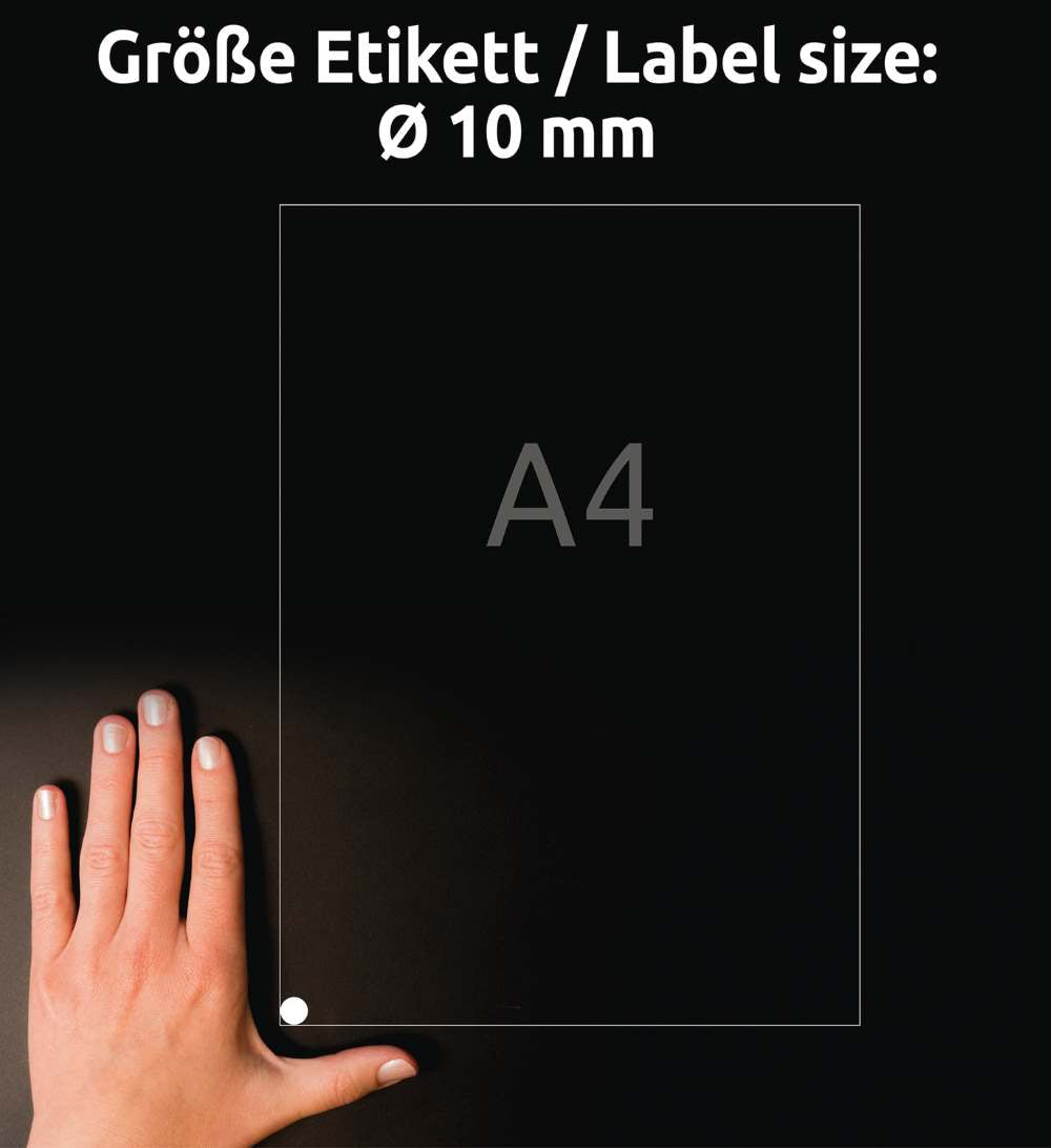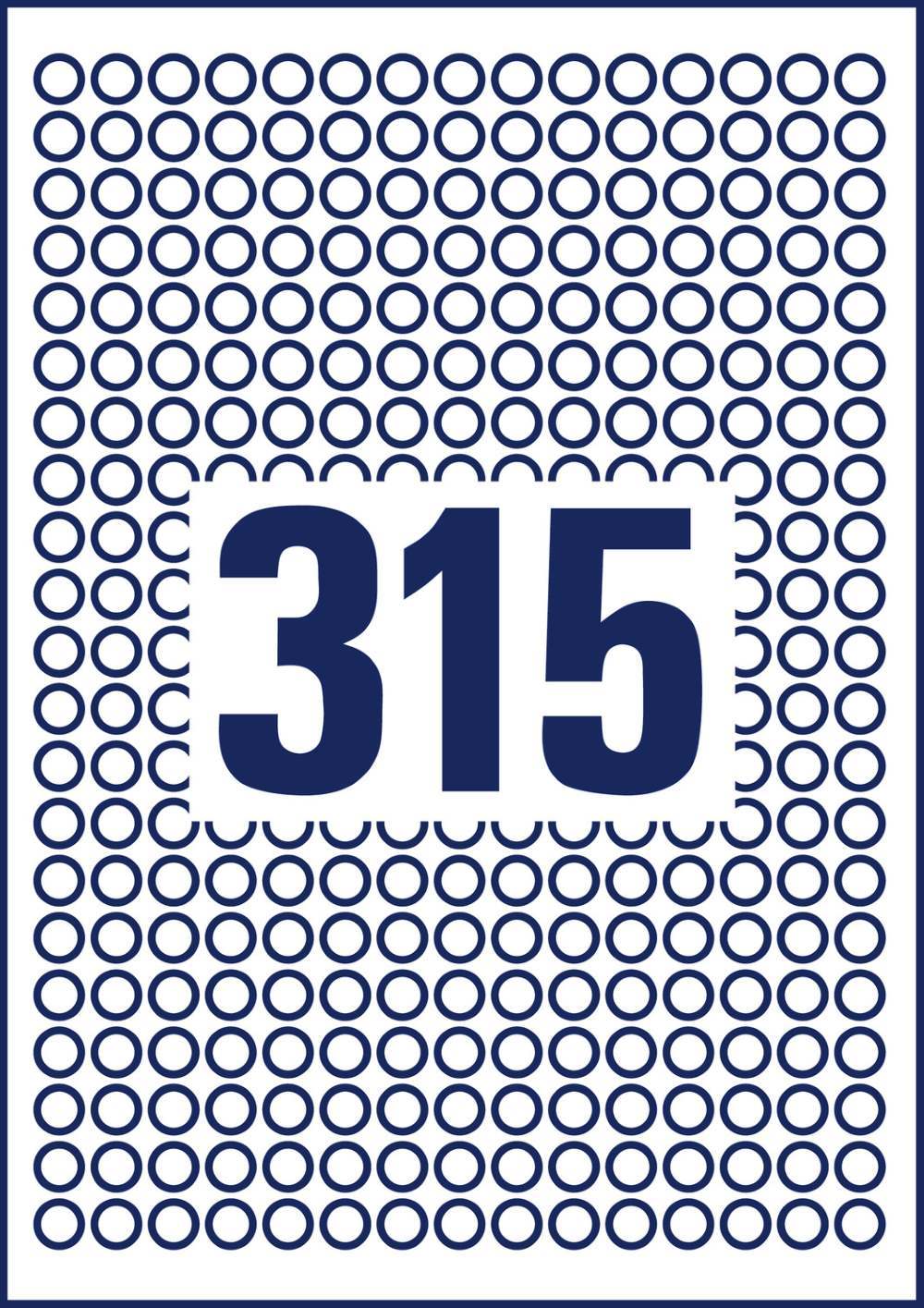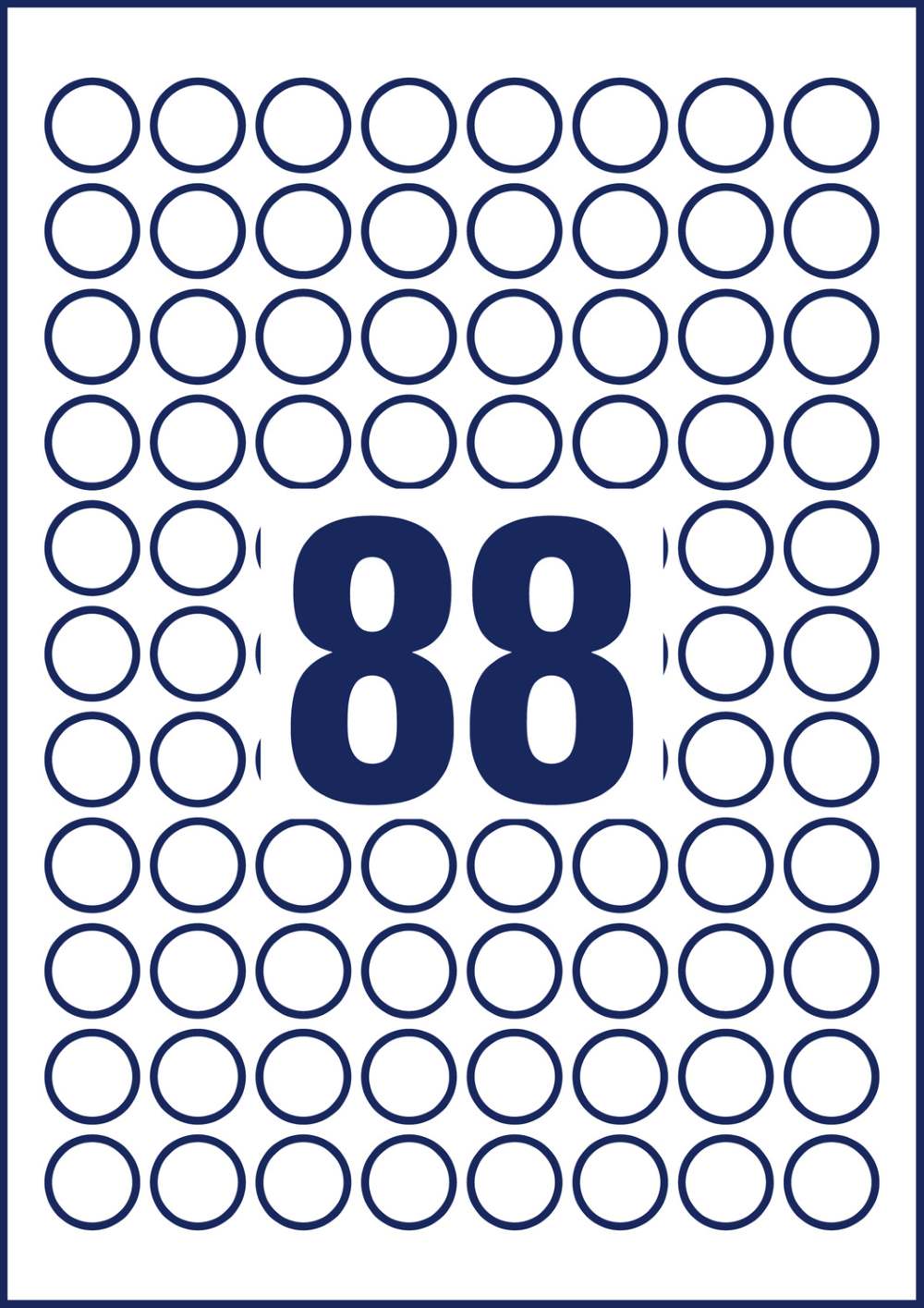 Na voljo v različnih premerih: premer 10 mm (v pakiranju je 3.150 etiket), 20 mm premer (v pakiranju je 880 etiket), 30 mm premer (v pakiranju je 480 etiket), 51 mm premer (v pakiranju je 150 etiket), 69 mm premer (v pakiranju je 80 etiket) ter premer 80 mm (60).