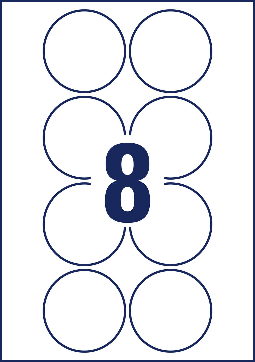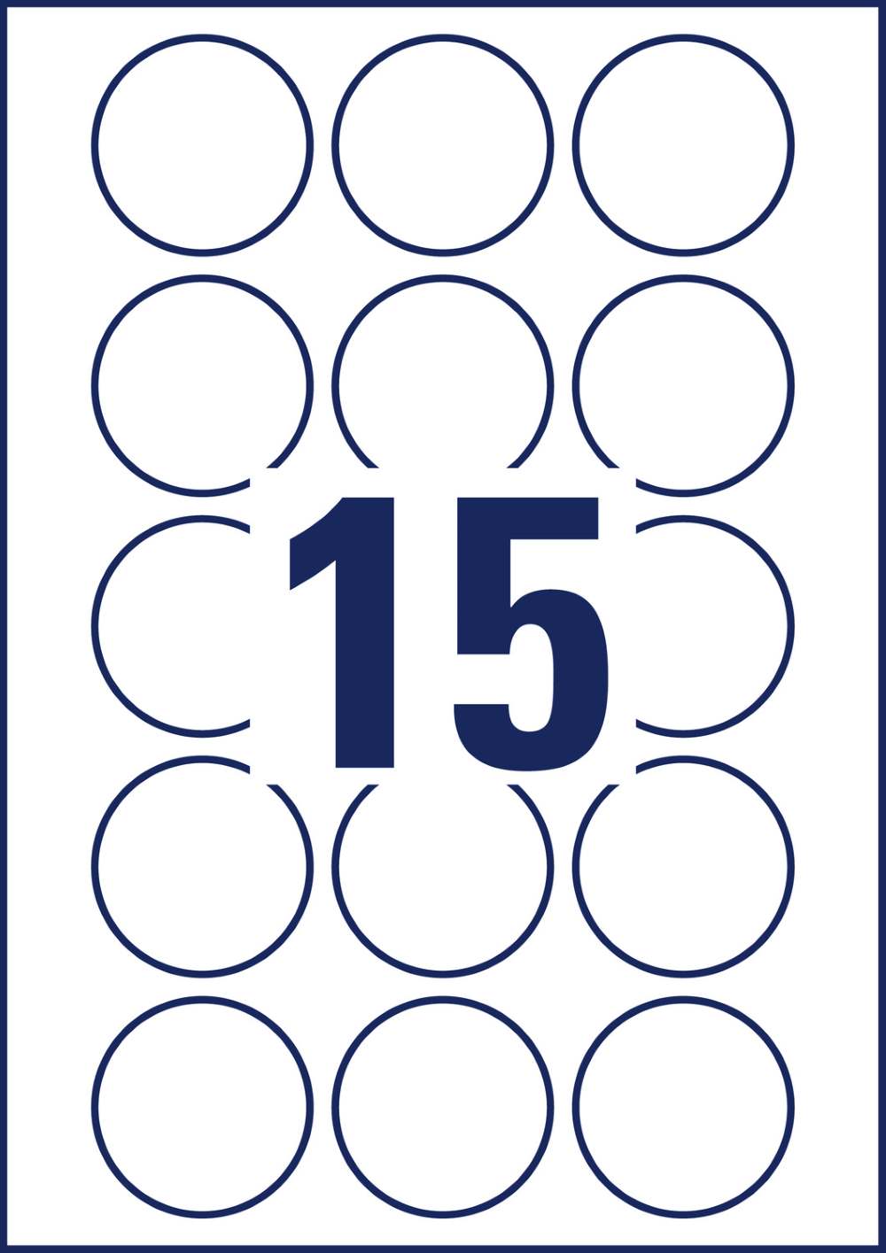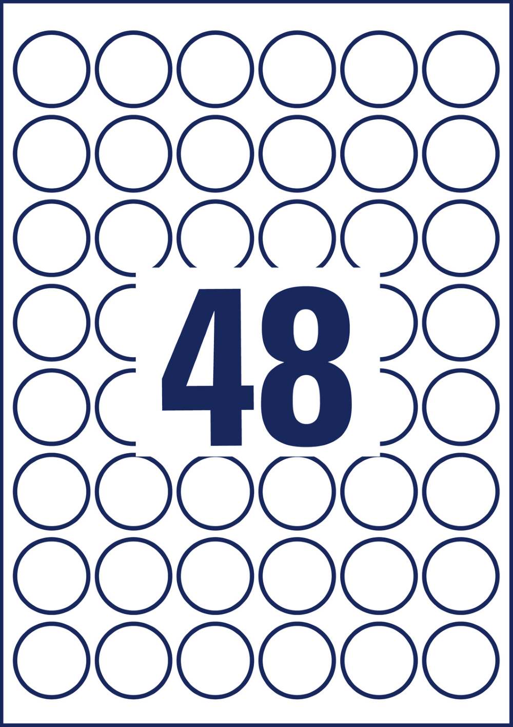 Na voljo v različnih premerih: premer 10 mm (v pakiranju je 3.150 etiket), 20 mm premer (v pakiranju je 880 etiket), 30 mm premer (v pakiranju je 480 etiket), 51 mm premer (v pakiranju je 150 etiket), 69 mm premer (v pakiranju je 80 etiket) ter premer 80 mm (60).
