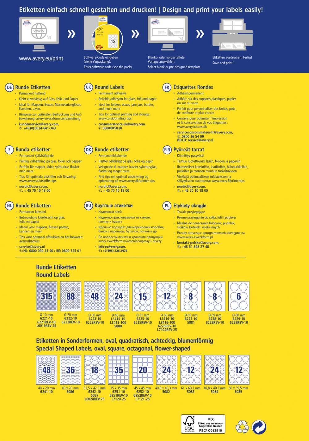 V zavitku je 10 listov, število etiket je odvisno od izbrane velikosti. Primerne so za tiskanje z vsemi standardnimi tiskalniki. Imajo FSC® certifikat - izvor lesa je iz zanesljivih virov. Oprijem tonerja je na etiketah zelo dober, tisk je oster in se ne packa. Za oblikovanje uporabite brezplačni program, dostopen je na www.avery-zweckform.si.