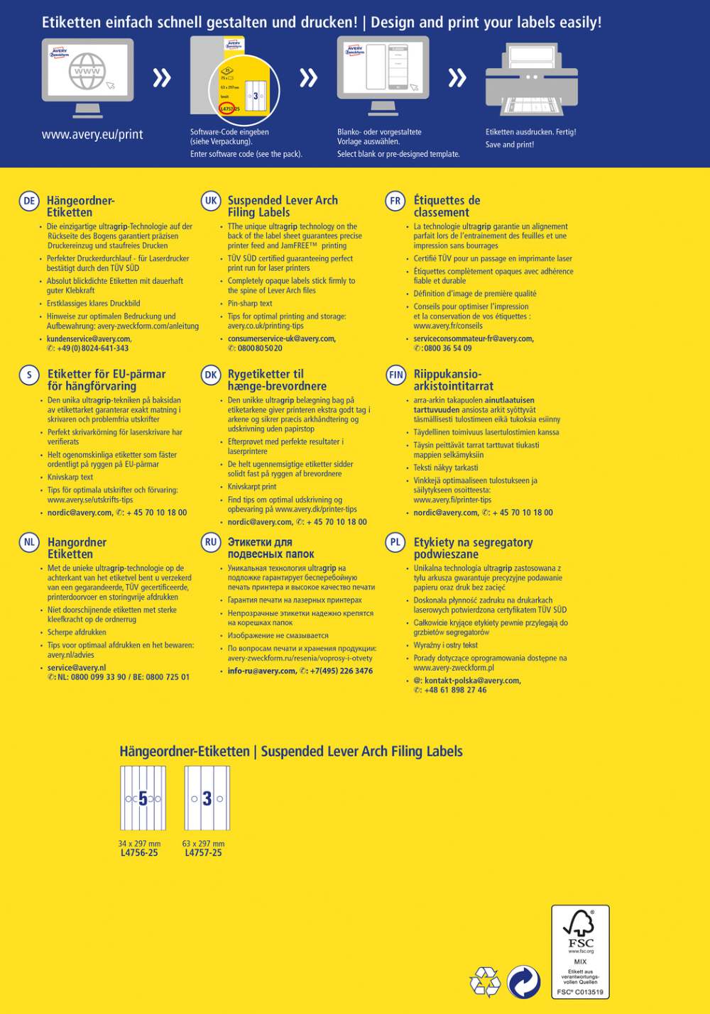 V zavitku je 25 listov, vseh etiket je 75. Nalepke imajo permanentno lepilo in so neprosojne, popolnoma prekrijejo stari tekst. Primerne so za tiskanje z vsemi standardnimi tiskalniki. Ultragrip tehnologija zagotavlja tiskanje brez zastoja. Imajo FSC® certifikat - izvor lesa je iz zanesljivih virov. Za oblikovanje uporabite brezplačni program, dostopen je na www.avery-zweckform.si.