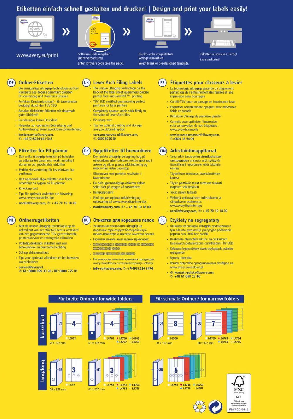 Nalepke imajo permanentno lepilo in so neprosojne, popolnoma prekrijejo stari tekst. Primerne so za tiskanje z vsemi standardnimi tiskalniki. Ultragrip tehnologija zagotavlja tiskanje brez zastoja. Imajo FSC® certifikat - izvor lesa je iz zanesljivih virov. Za oblikovanje uporabite brezplačni program, dostopen je na www.avery-zweckform.si. Dve varianti pakiranja: manjše (10 listov, vseh etiket je 30) ali srednje (30 listov, vseh etiket je 90).