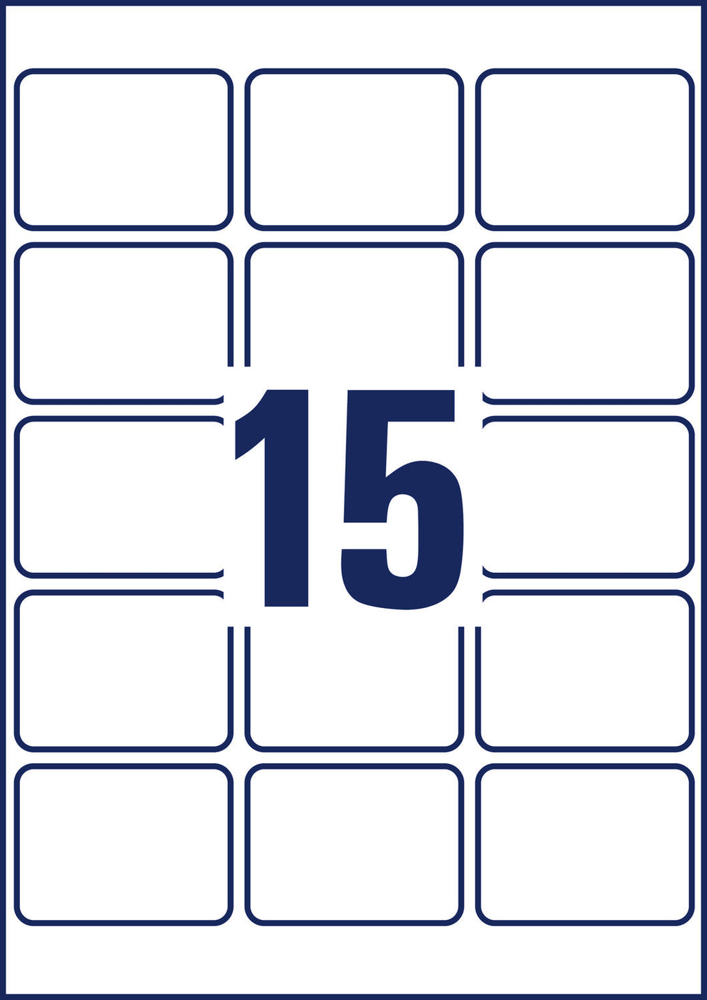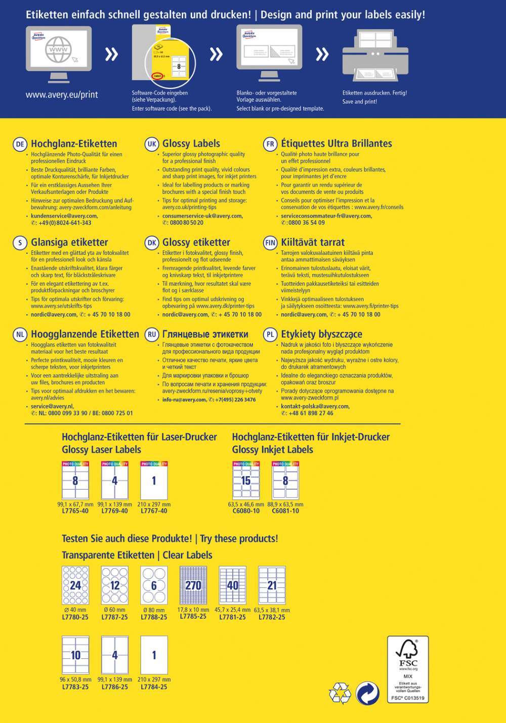 V zavitku je 10 listov, vseh etiket je 150. Nalepke imajo permanentno lepilo, zanesljiv oprijem in visoko sijajen premaz. Primerne so za tiskanje z inkjet tiskalniki. Etikete imajo FSC® certifikat - izvor lesa je iz preverjenih in zanesljivih virov. Za oblikovanje uporabite brezplačni program, dostopen je na www.avery-zweckform.si.