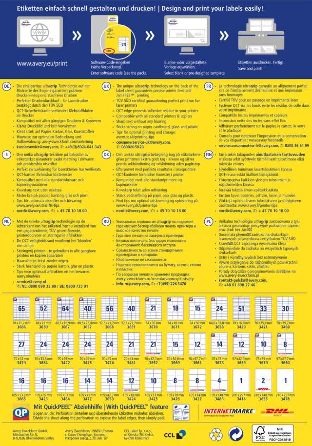 Nalepke imajo permanentno lepilo in zanesljiv oprijem na različnih podlagah. Primerne so za tiskanje z vsemi standardnimi tiskalniki. Imajo FSC® certifikat - izvor lesa je iz zanesljivih virov. Ultragrip tehnologija zagotavlja tiskanje brez zastoja. Za oblikovanje uporabite brezplačni program, dostopen je na www.avery-zweckform.si. Dve varianti pakiranja: manjše (v zavitku je 10 listov, vseh etiket je 210) in srednje pakiranje (v zavitku je 100 listov, vseh etiket je 2100).