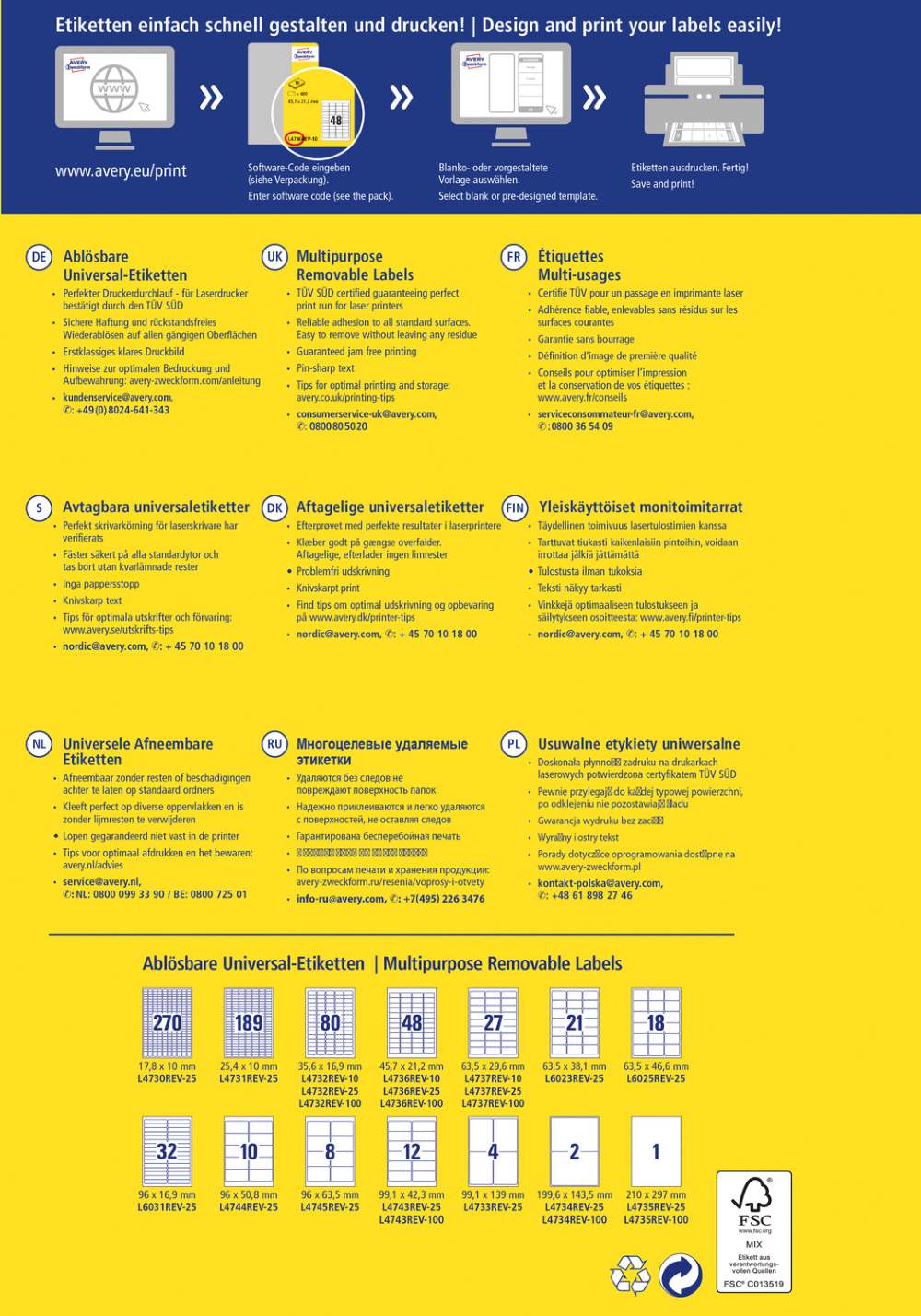 Nalepke imajo odstranljivo lepilo in zanesljiv oprijem na različnih podlagah. Primerne so za tiskanje z vsemi standardnimi tiskalniki. Idealne so za začasno označevanje. Etikete imajo FSC® certifikat - izvor lesa je iz preverjenih in zanesljivih virov. Za oblikovanje uporabite brezplačni program, dostopen je na www.avery-zweckform.si. Tri variante pakiranja: manjše (v zavitku je 10 listov, vseh etiket je 800), srednje (v zavitku je 30 listov, vseh etiket je 2.400) ali večje pakiranje (v zavitku je 100 listov, vseh etiket je 8.000).