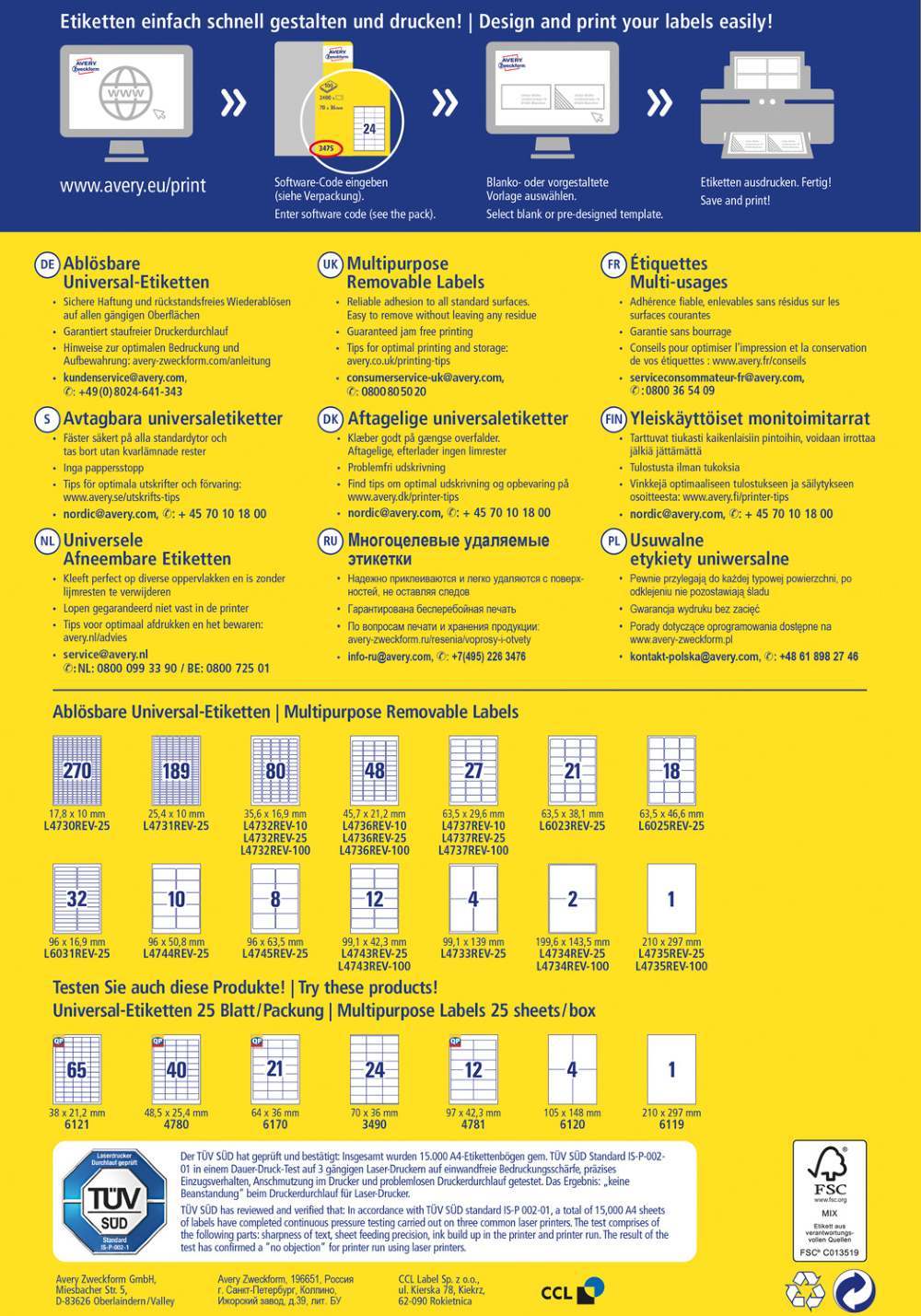 Nalepke imajo odstranljivo lepilo in zanesljiv oprijem na različnih podlagah. Primerne so za tiskanje z vsemi standardnimi tiskalniki. Idealne so za začasno označevanje. Etikete imajo FSC® certifikat - izvor lesa je iz preverjenih in zanesljivih virov. Za oblikovanje uporabite brezplačni program, dostopen je na www.avery-zweckform.si. Dve varianti pakiranja: srednje (v zavitku je 30 listov, vseh etiket je 60) ali večje pakiranje (v zavitku je 100 listov, vseh etiket je 200).