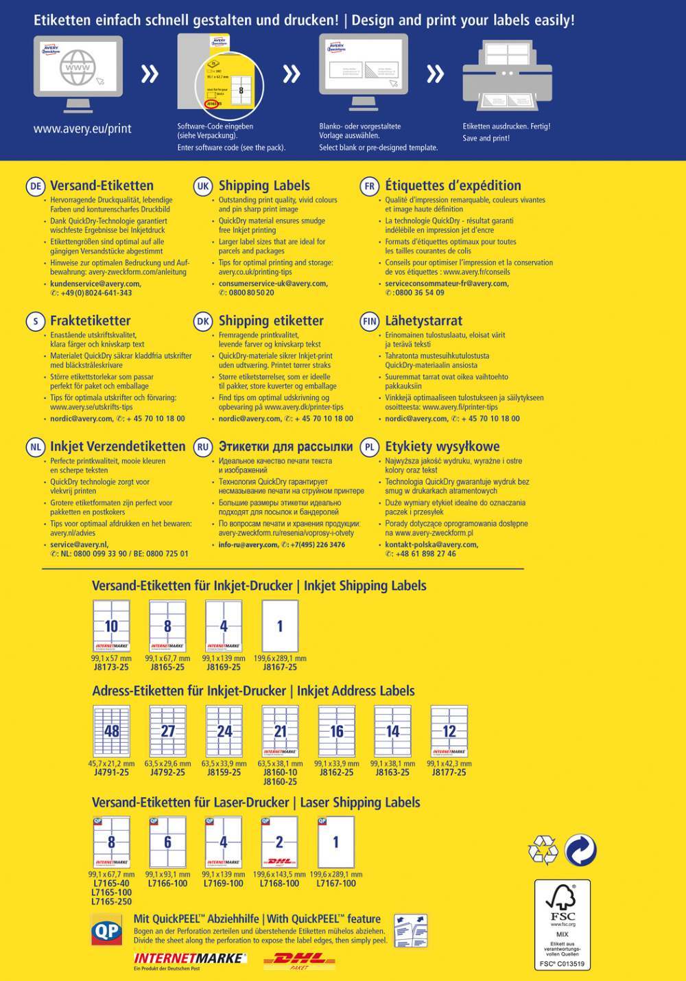 V zavitku je 25 listov, vseh etiket je 200. Nalepke imajo permanentno lepilo in zanesljiv oprijem na različnih podlagah. Primerne so za tiskanje z vsemi standardnimi inkjet tiskalniki. Edinstvena tehnologija QuickDry™ zagotavlja, da se izpis ne razmaže ter ima ostre robove in žive barve. Imajo FSC® certifikat - izvor lesa je iz zanesljivih virov. Za oblikovanje uporabite brezplačni program, dostopen je na www.avery-zweckform.si.