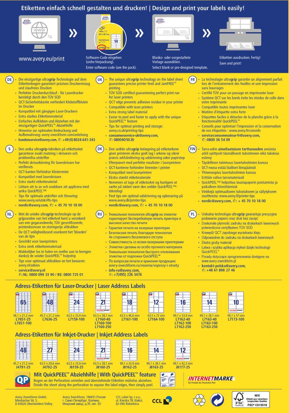 V zavitku je 100 listov, vseh etiket je 6500. Nalepke imajo permanentno lepilo in zanesljiv oprijem na različnih podlagah. Primerne so za tiskanje z laserskimi tiskalniki. Imajo FSC® certifikat - izvor lesa je iz zanesljivih virov. Ultragrip tehnologija zagotavlja tiskanje brez zastoja. QuickPEEL omogoča preprosto in hitro odlepljanje etiket od podlage. Za oblikovanje uporabite brezplačni program, dostopen je na www.avery-zweckform.si.