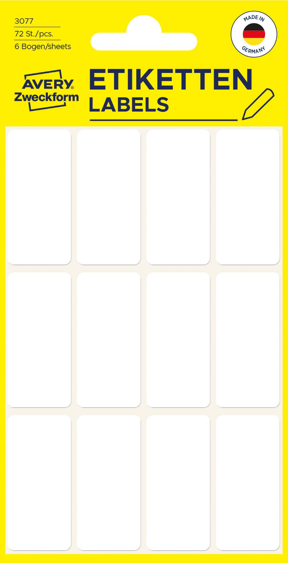 V zavitku je 6 listov, vseh etiket je 72. Nalepke imajo permanentno lepilo in so idealne za označevanje tako na delovnem mestu kot doma. Namenjene so za ročno pisanje z običajnimi pisali in niso primerne za tiskanje. Beljene so brez klora in so 100 % izdelane iz papirja s certifikatom FSC® - izvor lesa je iz preverjenih in zanesljivih virov.