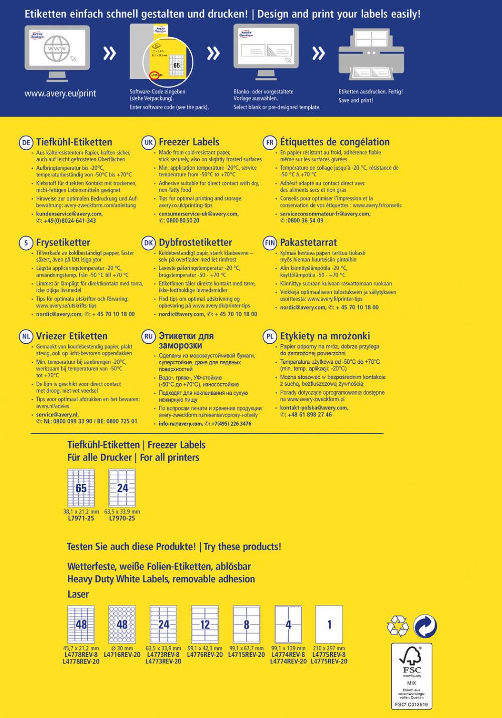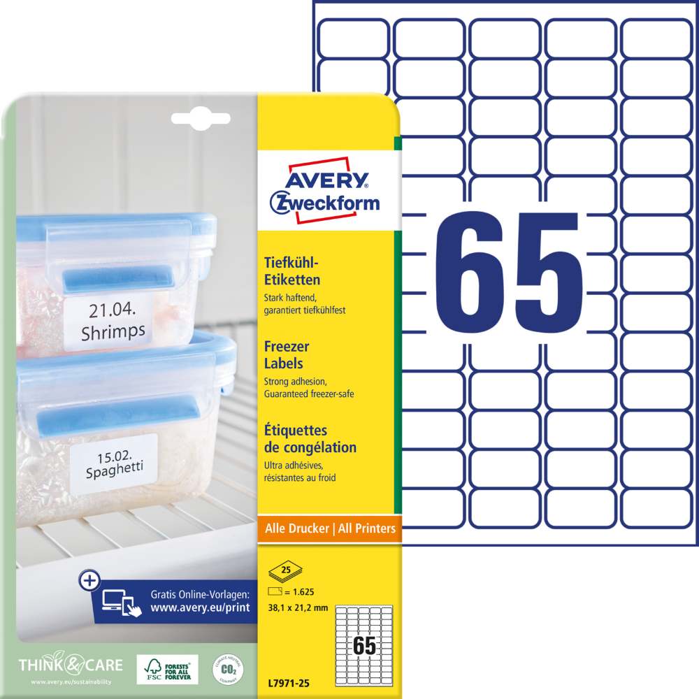 V zavitku je 25 listov, vseh etiket je 1625. Nalepke imajo zanesljiv oprijem tudi na rahlo ukrivljenih ali nepravilnih površinah in so odporne na zamrzovanje. Primerne so za tiskanje z vsemi standardnimi tiskalniki. Idealne so za označevanje zamrznjenih izdelkov. Beljene so brez klora in so 100 % izdelane iz papirja s certifikatom FSC®. Za oblikovanje uporabite brezplačni program, dostopen je na www.avery-zweckform.si.