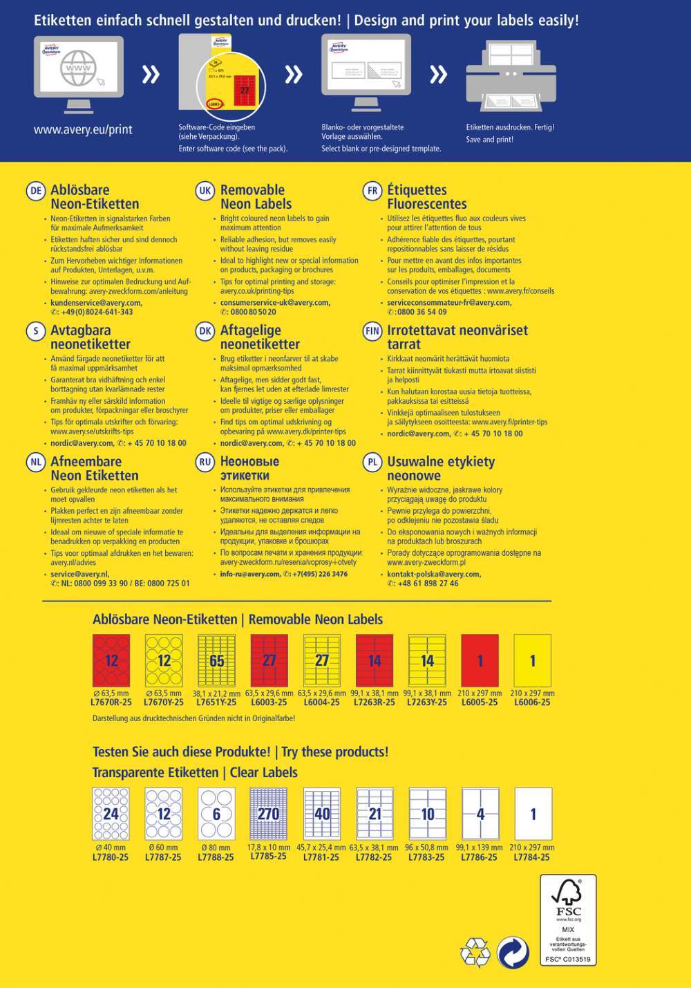V zavitku je 25 listov, vseh etiket je 675. Nalepke imajo odstranljivo lepilo in zanesljiv oprijem na različnih podlagah. Primerne so za tiskanje z vsemi standardnimi laserskimi tiskalniki. Idealne so za začasno označevanje. Etikete imajo FSC® certifikat - izvor lesa je iz preverjenih in zanesljivih virov. Za oblikovanje uporabite brezplačni program, dostopen je na www.avery-zweckform.si.