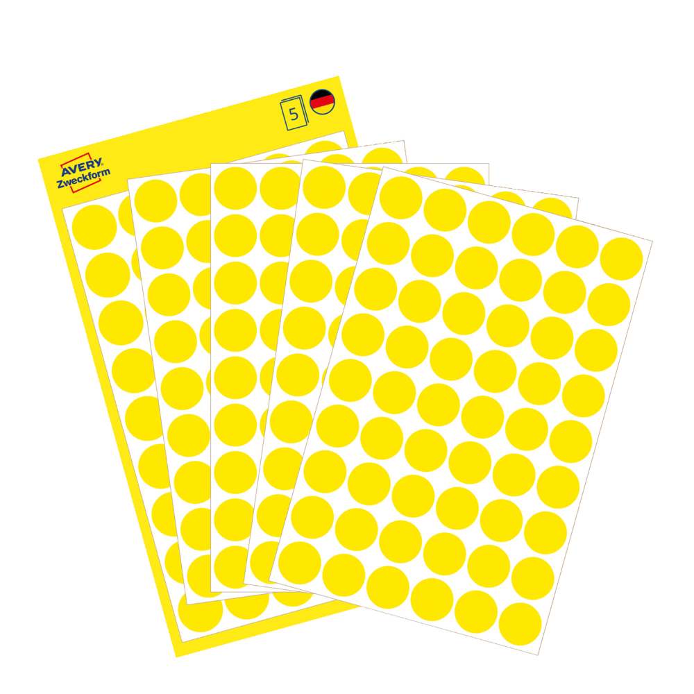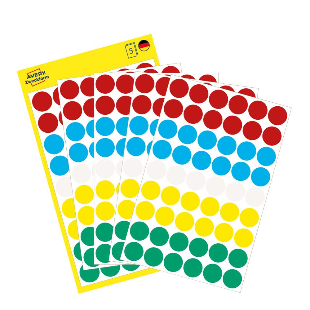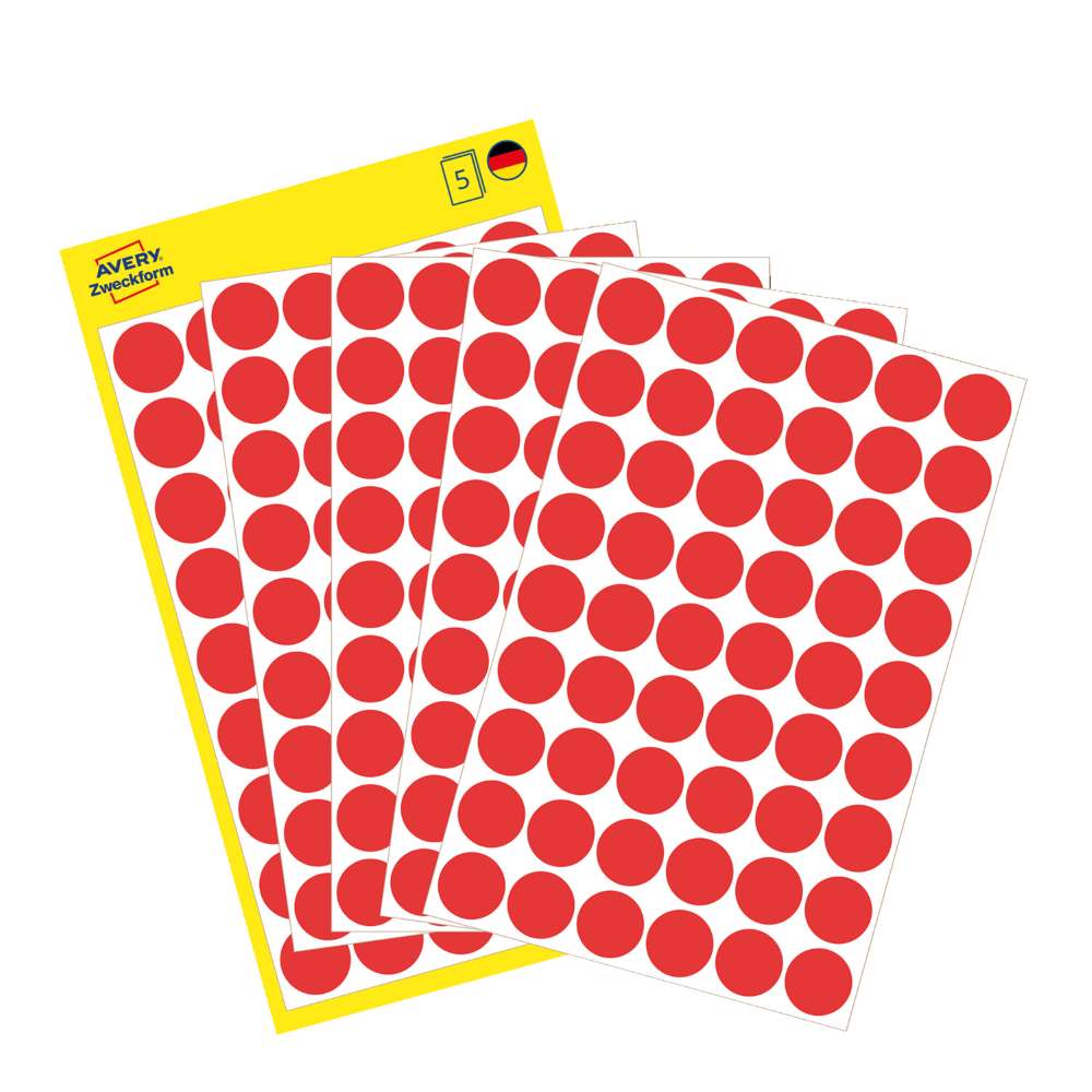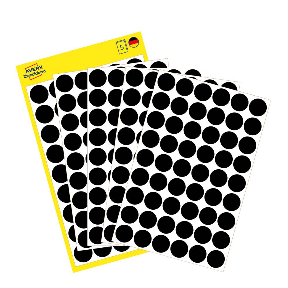 Na voljo v dveh velikostih: manjše, premera 8 mm (v zavitku so 4 listi, skupaj 416 etiket), srednje, premera 12 mm (v zavitku je 5 listov, skupaj 270 etiket) ali večje, premera 18 mm (v zavitku v zavitku so 4 listi, skupaj 96 etiket).