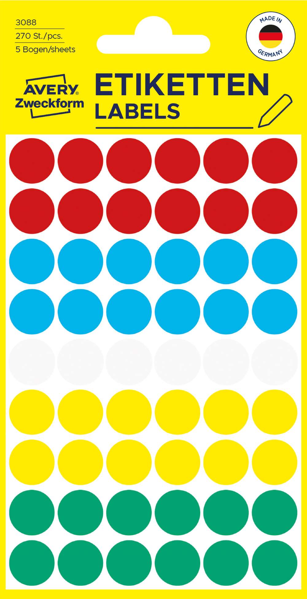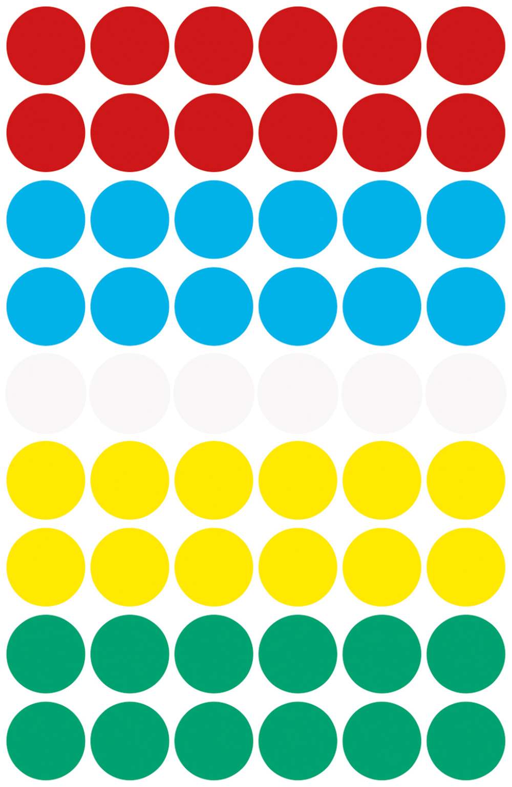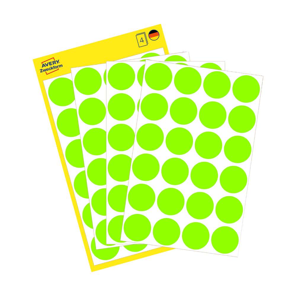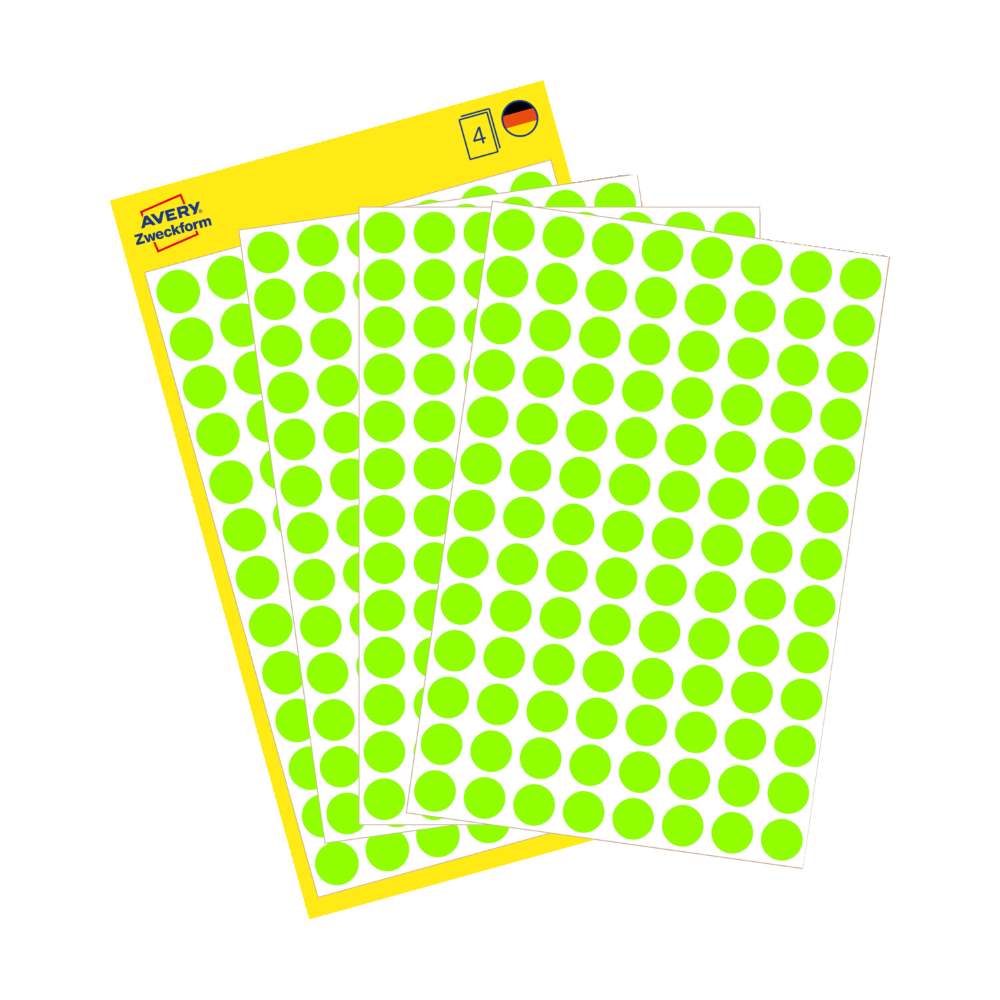 Na voljo v dveh velikostih: manjše, premera 8 mm (v zavitku so 4 listi, skupaj 416 etiket), srednje, premera 12 mm (v zavitku je 5 listov, skupaj 270 etiket) ali večje, premera 18 mm (v zavitku v zavitku so 4 listi, skupaj 96 etiket).