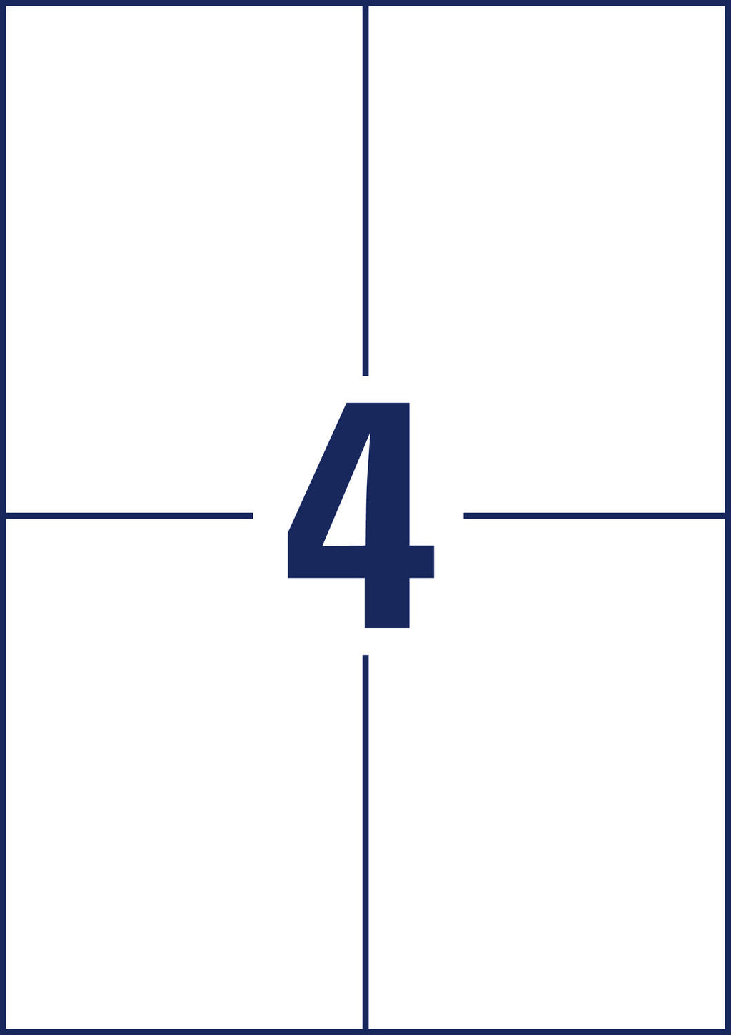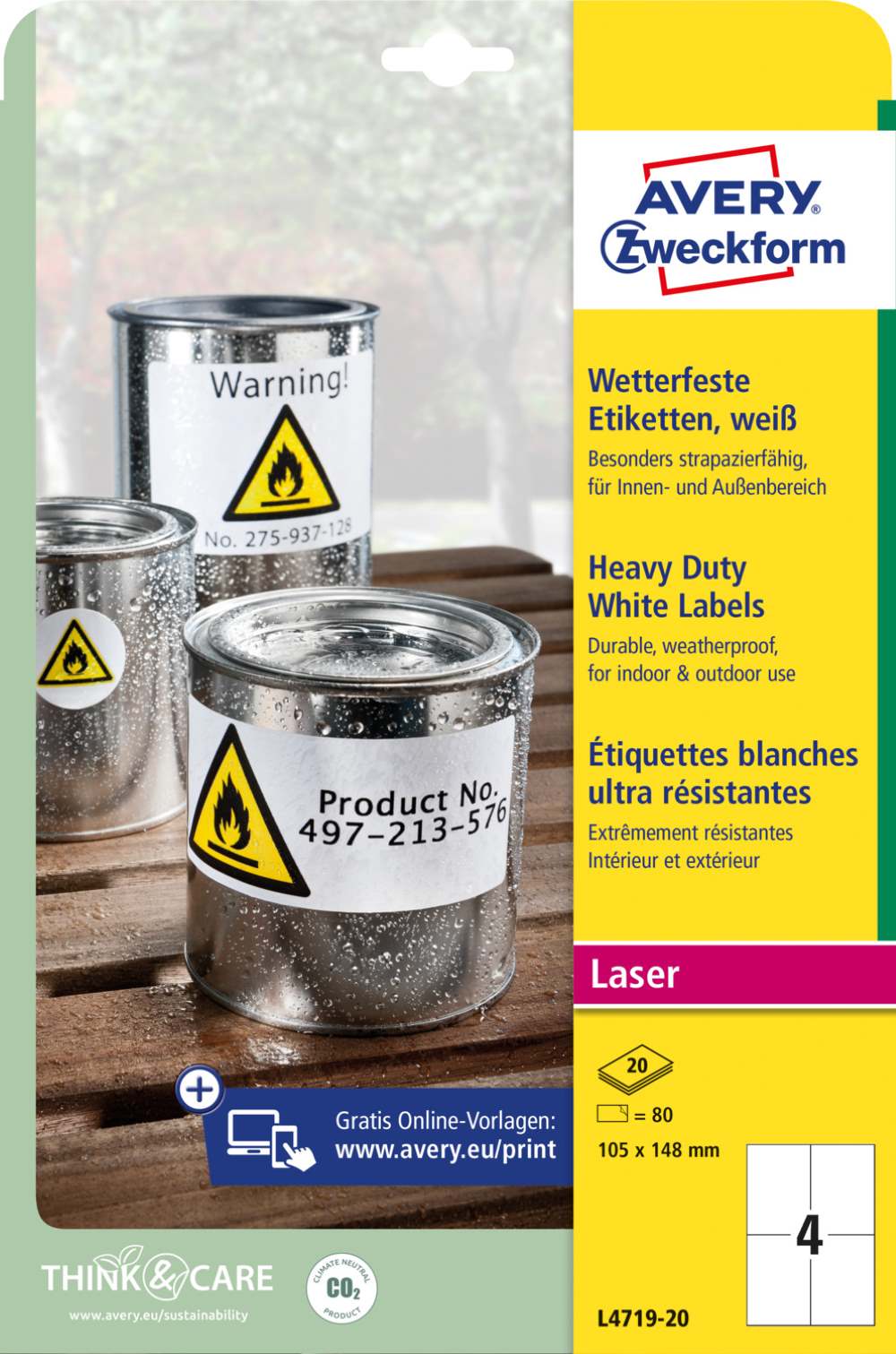 V zavitku je 20 listov, vseh etiket je 80. Nalepke imajo permanentno lepilo in zanesljiv oprijem na različnih podlagah. Primerne so za tiskanje z laserskimi tiskalniki. Se ne trgajo in so odporne na olje, umazanijo, UV žarke, temperaturo in vodo. Idealne so za trajno označevanje. Etikete ne vsebujejo PVC in so proizvedene podnebno nevtralno. Za oblikovanje uporabite brezplačni program, dostopen je na www.avery-zweckform.si.