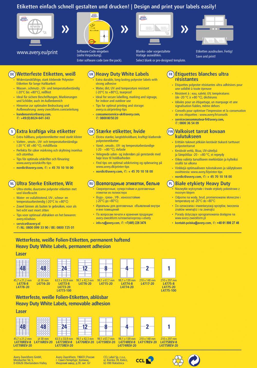 V zavitku je 100 listov, vseh etiket je 100. Nalepke imajo permanentno lepilo in zanesljiv oprijem na različnih podlagah. Primerne so za tiskanje z laserskimi tiskalniki. Se ne trgajo in so odporne na olje, umazanijo, UV žarke, temperaturo in vodo. Idealne so za trajno označevanje. Etikete ne vsebujejo PVC in so proizvedene podnebno nevtralno. Za oblikovanje uporabite brezplačni program, dostopen je na www.avery-zweckform.si.