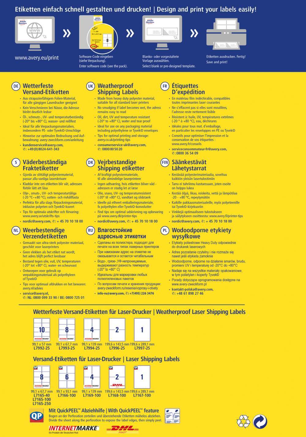 V zavitku je 25 listov, vseh etiket je 25. Nalepke imajo permanentno lepilo in zanesljiv oprijem na različnih podlagah. Primerne so za tiskanje z laserskimi tiskalniki. Se ne trgajo in so odporne na olje, umazanijo, UV žarke, temperaturo in vodo. Idealne so za označevanje paketov. Etikete ne vsebujejo PVC in so proizvedene podnebno nevtralno. Za oblikovanje uporabite brezplačni program, dostopen je na www.avery-zweckform.si.