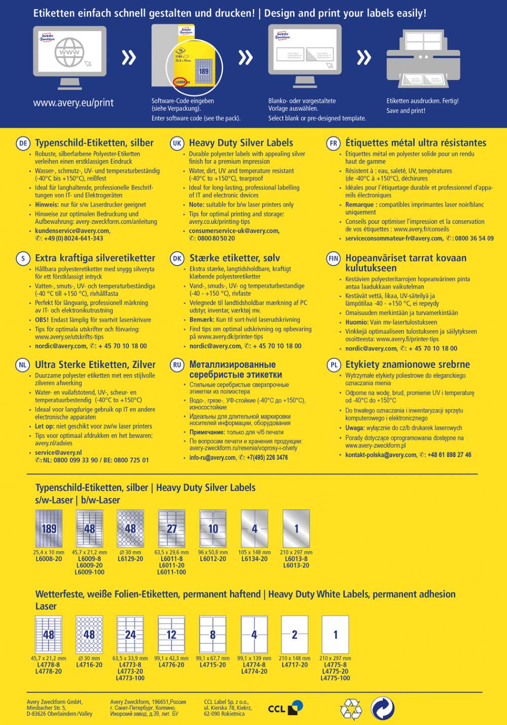 Nalepke imajo permanentno lepilo in zanesljiv oprijem na različnih podlagah. Primerne so za tiskanje s črno/belimi laserskimi tiskalniki. Se ne trgajo in so odporne na olje, umazanijo, UV žarke, temperaturo in vodo. Idealne so za trajno označevanje. Etikete ne vsebujejo PVC in so proizvedene podnebno nevtralno. Za oblikovanje uporabite brezplačni program, dostopen je na www.avery-zweckform.si. Na voljo 2 varianti pakiranja: malo (v zavitku je 20 listov, vseh etiket je 960) ali veliko (v zavitku je 100 listov, vseh etiket je 4.800).