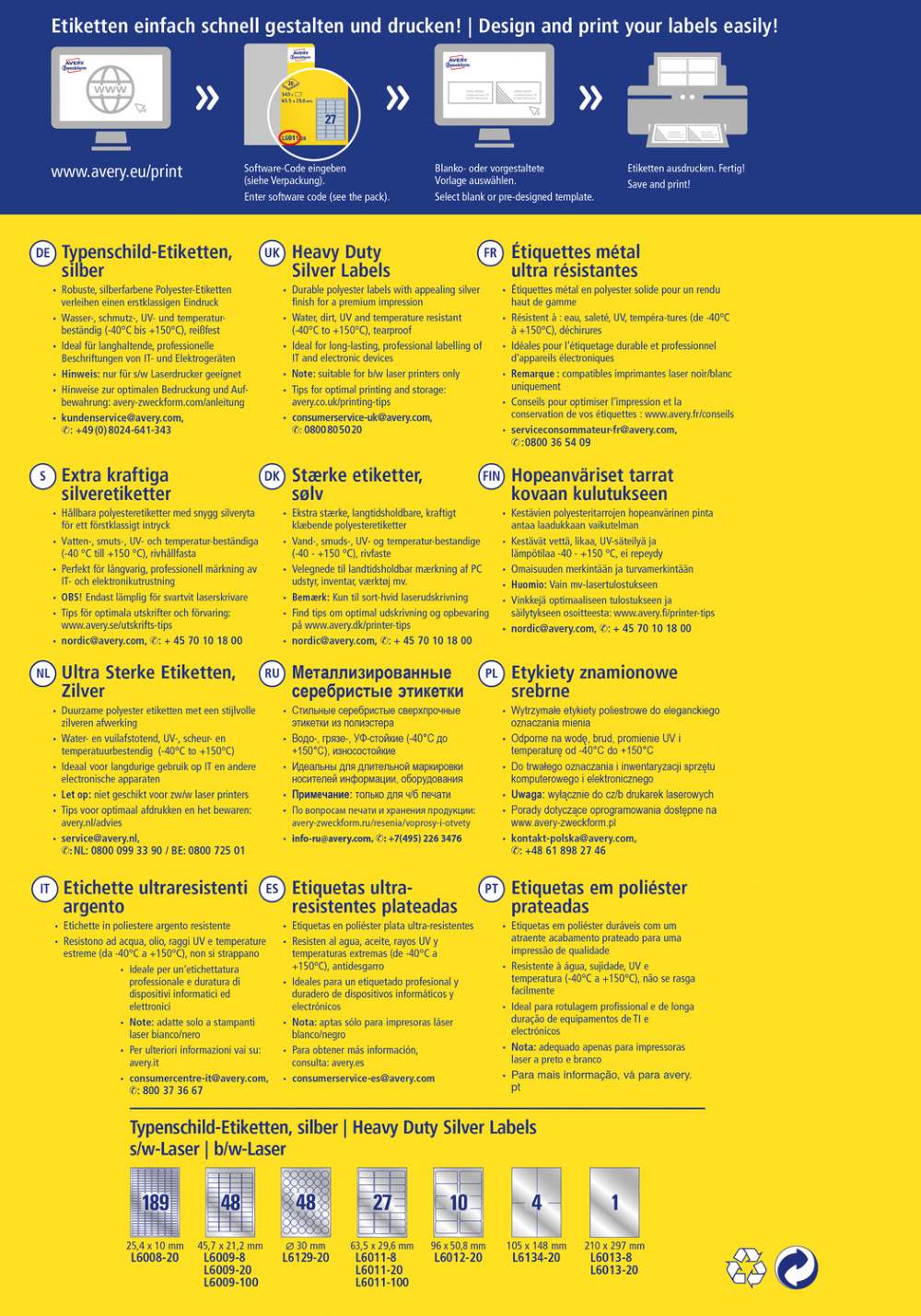 V zavitku je 8 listov, vseh etiket je 216. Nalepke imajo permanentno lepilo in zanesljiv oprijem na različnih podlagah. Primerne so za tiskanje s črno/belimi laserskimi tiskalniki. Se ne trgajo in so odporne na olje, umazanijo, UV žarke, temperaturo in vodo. Idealne so za trajno označevanje. Etikete ne vsebujejo PVC in so proizvedene podnebno nevtralno. Za oblikovanje uporabite brezplačni program, dostopen je na www.avery-zweckform.si.