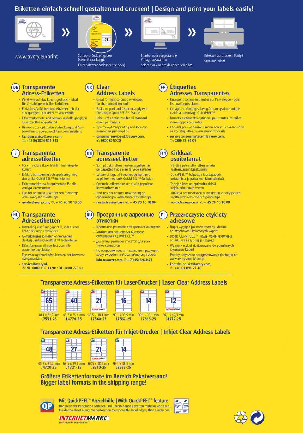 V zavitku je 25 listov, vseh etiket je 525. Nalepke so prosojne imajo permanentno lepilo in zanesljiv oprijem. Narejene so iz transparentnega poliestra se ne trgajo in so odporne na olje, umazanijo in temperaturne spremembe. Primerne so za tiskanje z vsemi standardnimi laserskimi tiskalniki. QuickPEEL omogoča preprosto in hitro odlepljanje etiket od podlage. Za oblikovanje uporabite brezplačni program, dostopen je na www.avery-zweckform.si.