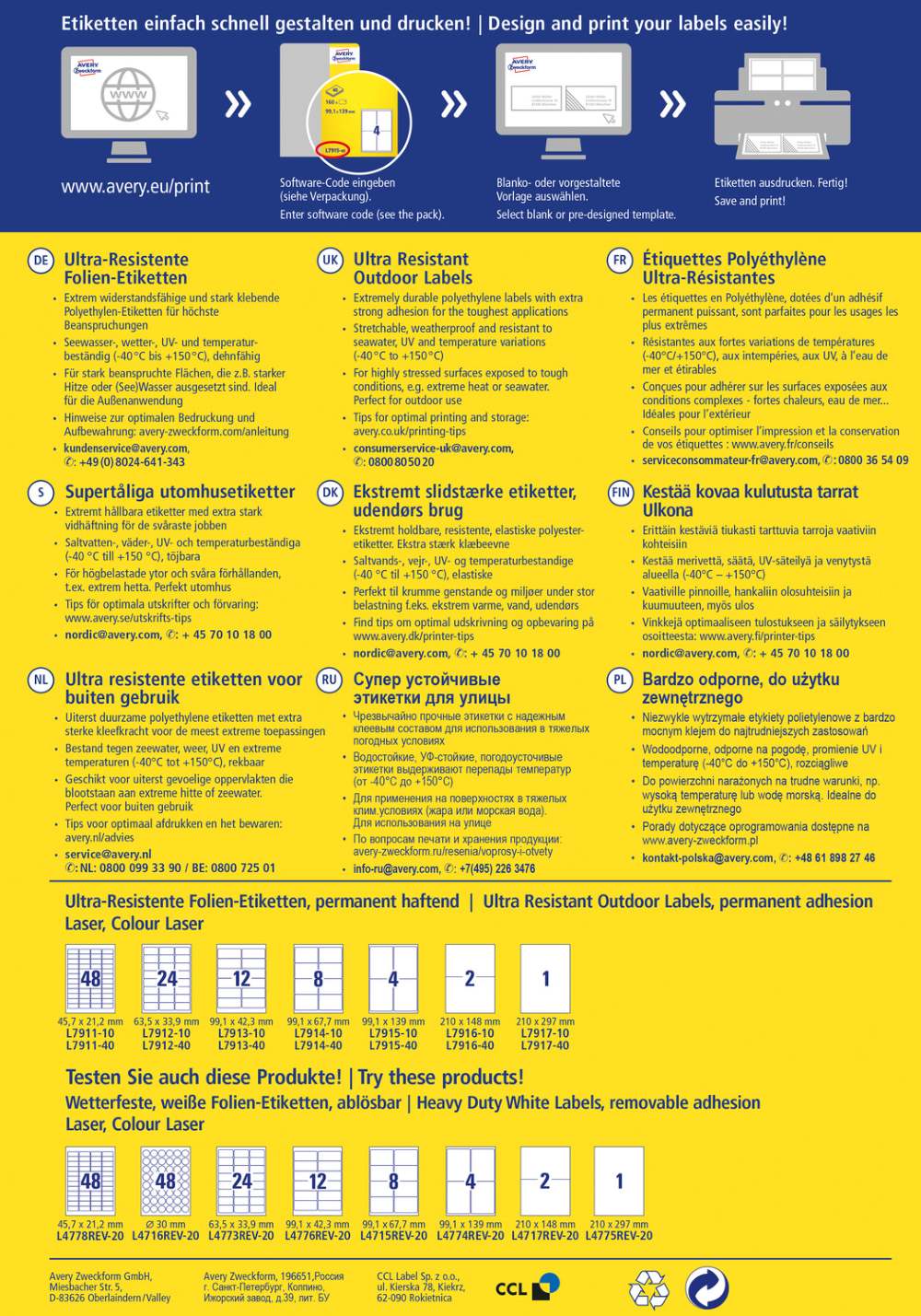 Nalepke imajo permanentno lepilo in močen oprijem tudi na zahtevnih površinah. Primerne so za tiskanje z laserskimi tiskalniki. Etikete so nekoliko raztegljive in odporne na olje, UV žarke, temperaturne spremembe, morsko vodo, čistila, razkužila in topila. Idealne so za trajno označevanje. Etikete ne vsebujejo PVC. Za oblikovanje uporabite brezplačni program, dostopen je na www.avery-zweckform.si. Dve varianti pakiranja: manjše pakiranje (v zavitku je 10 listov, vseh etiket je 480) ali srednje pakiranje (v zavitku je 40 listov, vseh etiket je 1.920).