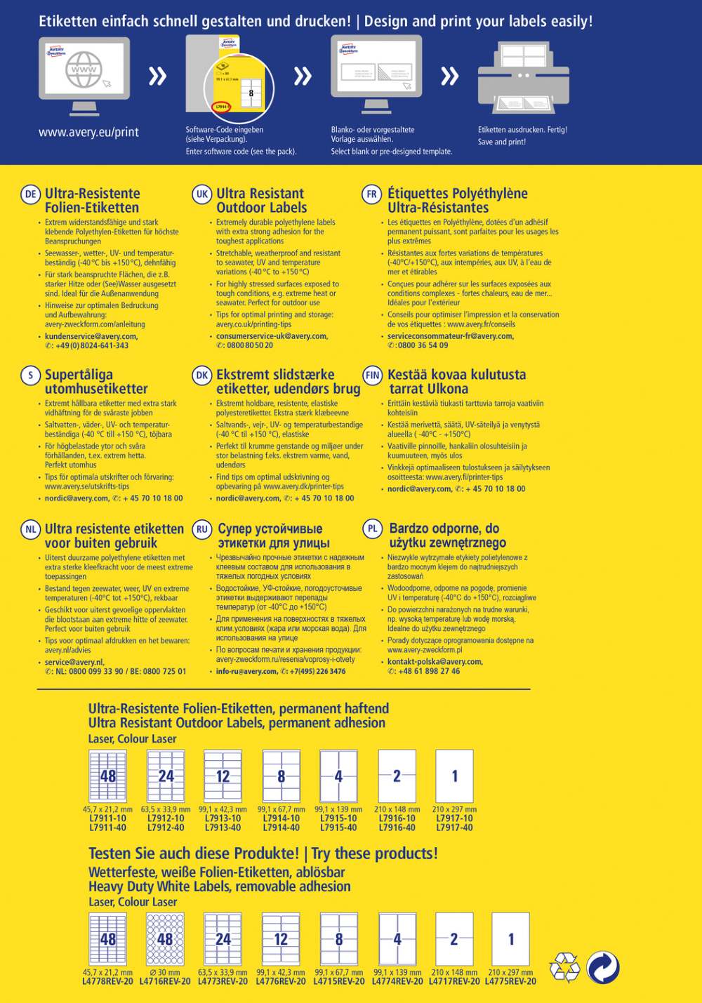 Nalepke imajo permanentno lepilo in so primerne za uporabo tudi na prostem. Primerne so za tiskanje z laserskimi tiskalniki. Narejene so iz polietilena, ki ne vsebuje PVC. Zelo so trpežne ter odporne na morsko vodo, vremenske vplive, olje, umazanijo, čistila, topila, UV žarke in temperaturo od -40 °C do +150 °C. Za oblikovanje uporabite brezplačni program, dostopen je na www.avery-zweckform.si. Dve varianti pakiranja: manjše pakiranje (v zavitku je 10 listov, vseh etiket je 10) ali srednje pakiranje (v zavitku je 40 listov, vseh etiket je 40).