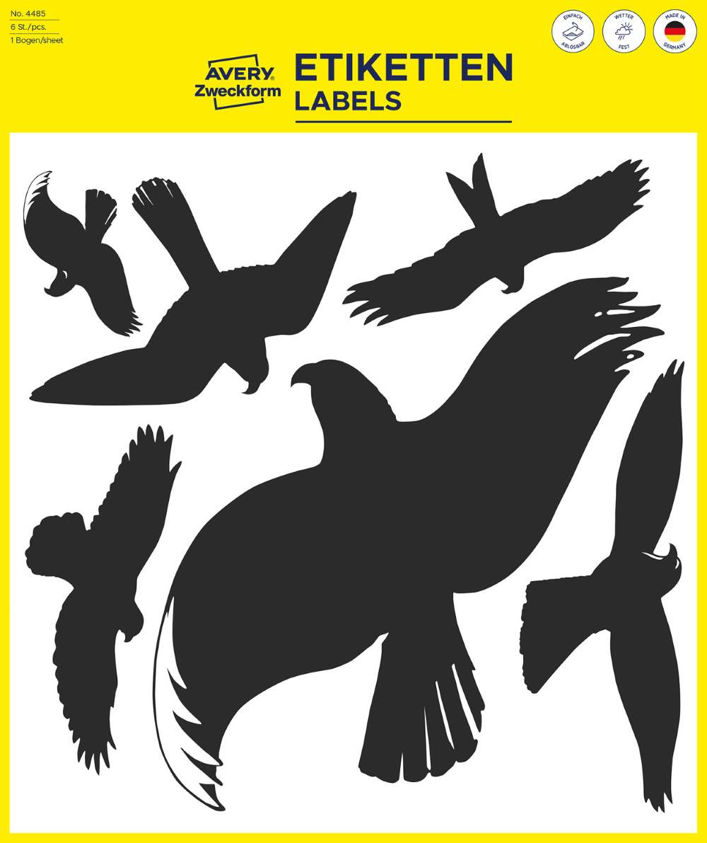 V zavitku je 1 pola, vseh skupaj je 6 etiket. Opozorilne nalepke z motivi ptic so odporne na vremenske vplive in odstranljive, saj so brez lepila. Nalepite etikete na vaša okna in preprečite zaletavanje ptic. Izdelano v Nemčiji.