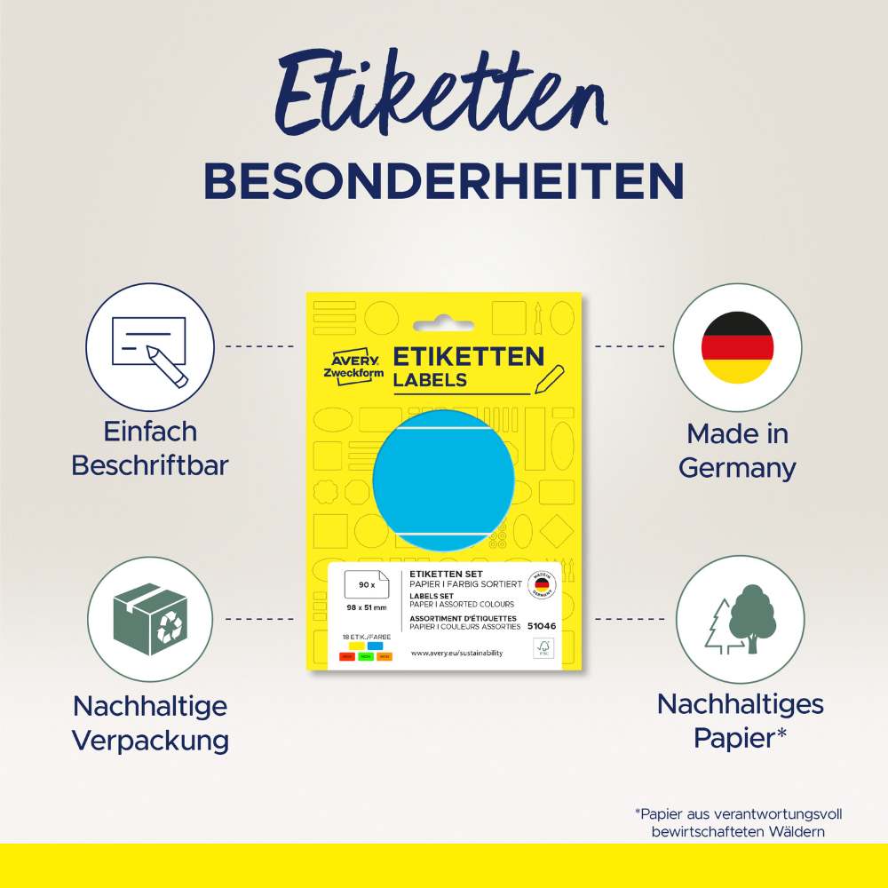 V zavitku je 30 listov, vseh etiket je 90. Nalepke imajo permanentno lepilo in so idealne za označevanje, organiziranje, razporejanje in načrtovanje. Beljene so brez klora in so 100 % izdelane iz papirja s certifikatom FSC® - izvor lesa je iz preverjenih in zanesljivih virov. Niso primerne za tiskanje.
