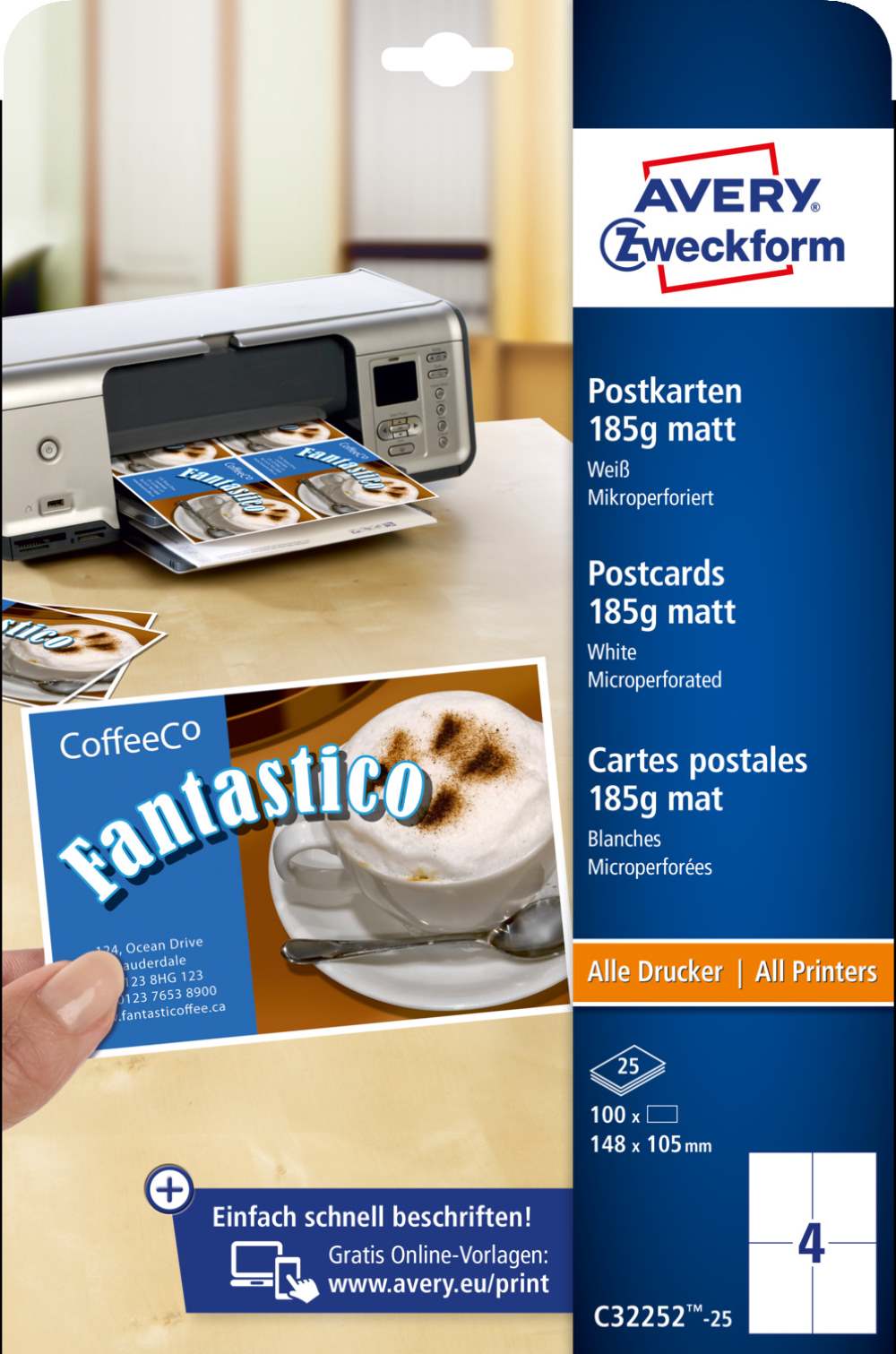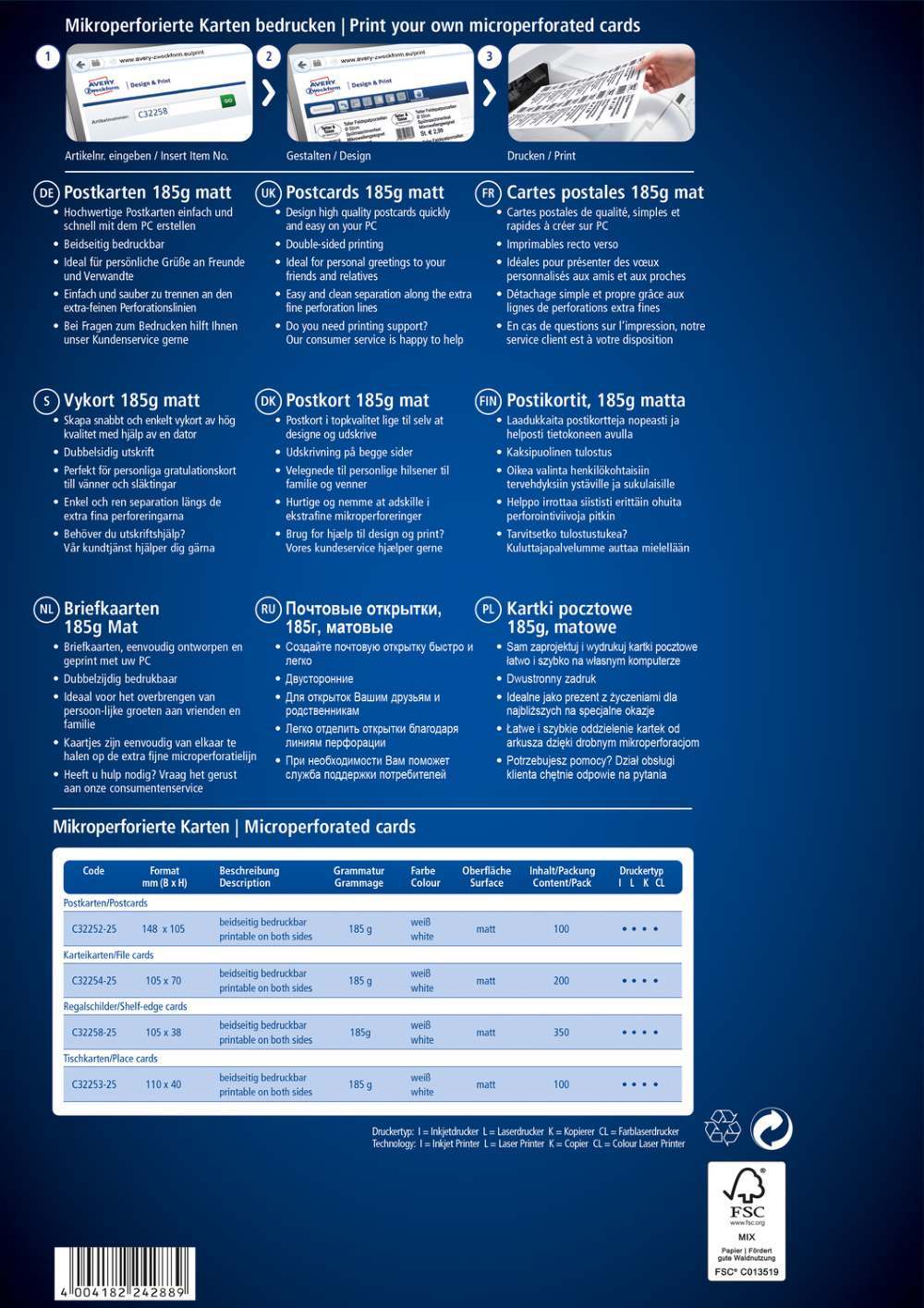 V zavitku je 25 listov, vseh kartončkov je 100. Primerni so za tiskanje z vsemi običajnimi inkjet in laserskimi tiskalniki. Mikroperforirane dopisnice lahko potiskate po obeh straneh. Enostavne za oblikovanje, tiskanje in ločevanje. Imajo FSC® certifikat - izvor lesa je iz preverjenih in zanesljivih virov. Za oblikovanje uporabite brezplačni program, dostopen je na www.avery-zweckform.si.