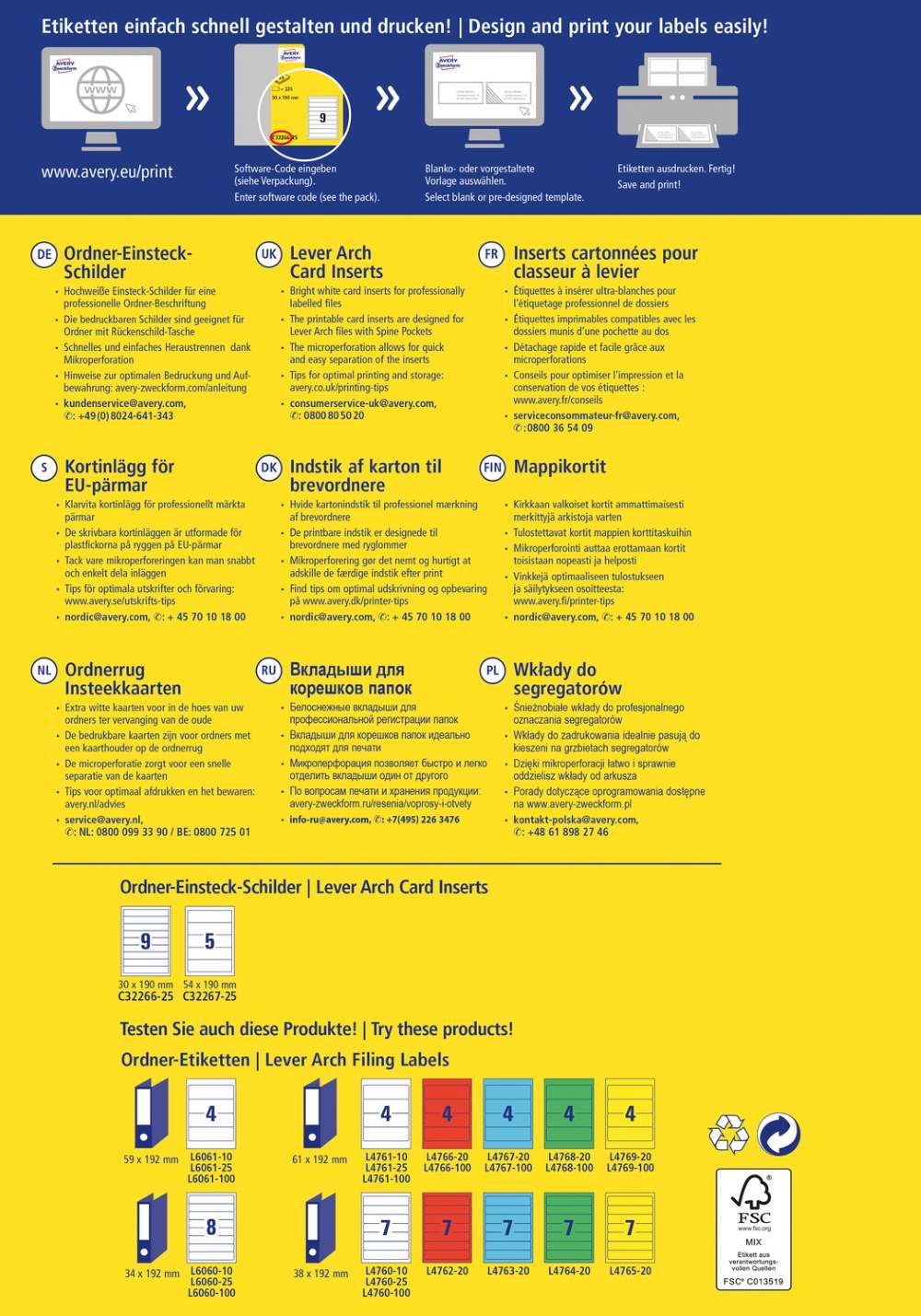 V zavitku je 25 listov, vseh kartončkov je 125. Primerni so za tiskanje z inkjet in laserskimi tiskalniki. Vstavni kartončki so narejeni iz visoko kakovostnega kartona in imajo fino mikroperforacijo. Idealni za široke registratorje. Enostavni za oblikovanje, tiskanje in ločevanje. Imajo FSC® certifikat - izvor lesa je iz preverjenih in zanesljivih virov. Za oblikovanje uporabite brezplačni program, dostopen je na www.avery-zweckform.si.