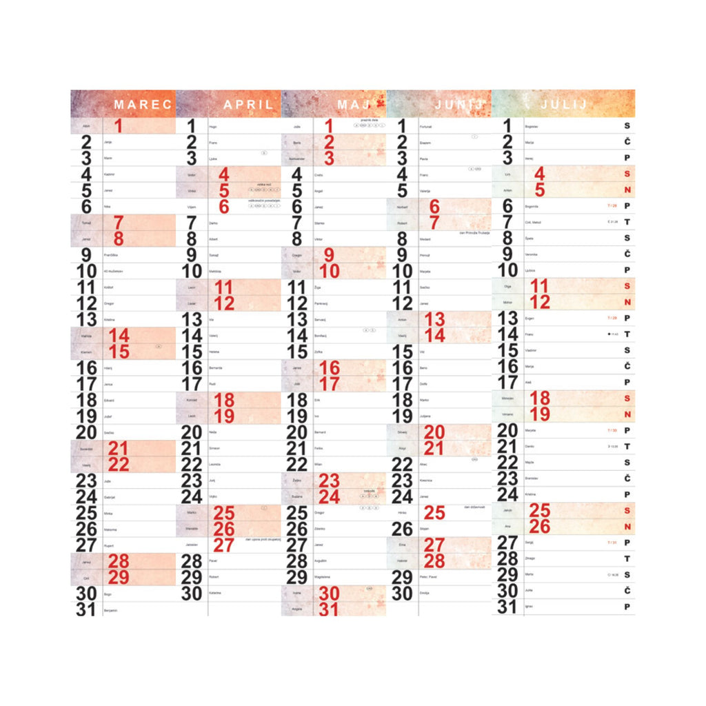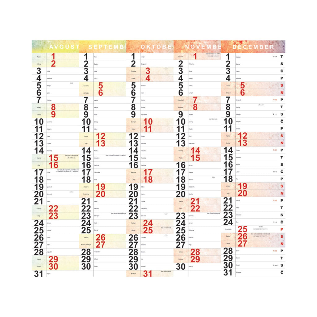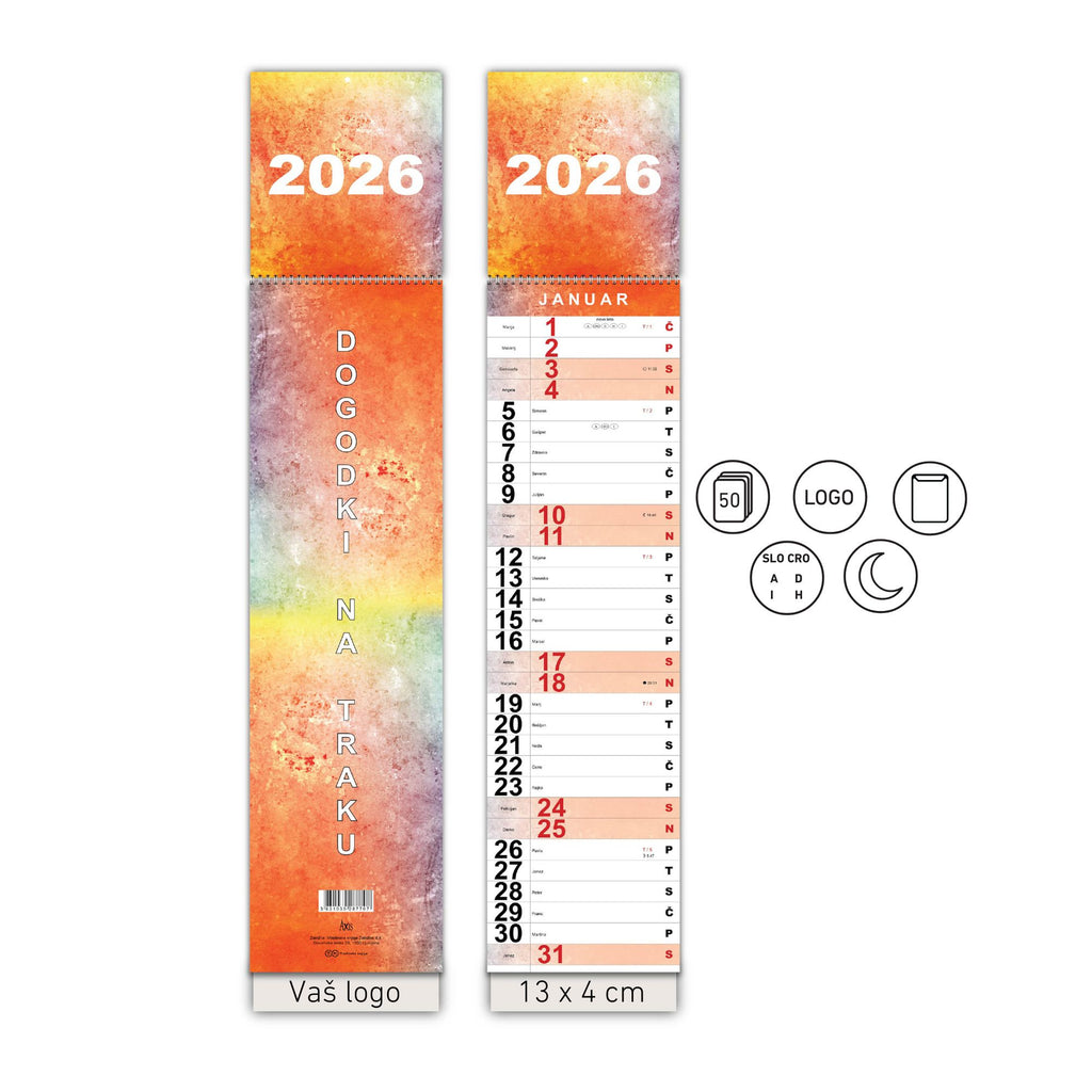 Spiralna vezava, označeni prazniki držav SLO, A, I, CRO, H, D, lunine mene, krstna imena, vložen v vrečko, mogoč natis logotipa na pasico 13 x 4 cm.