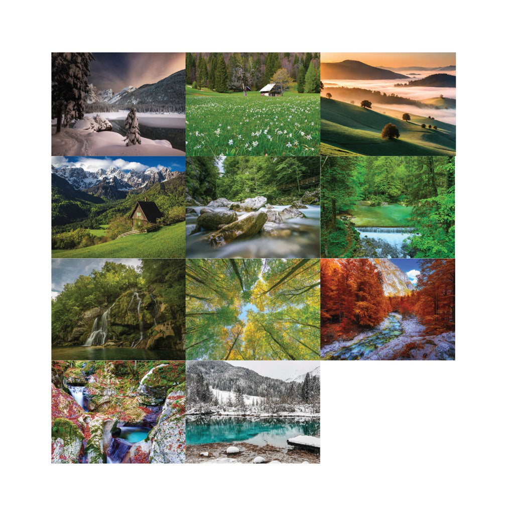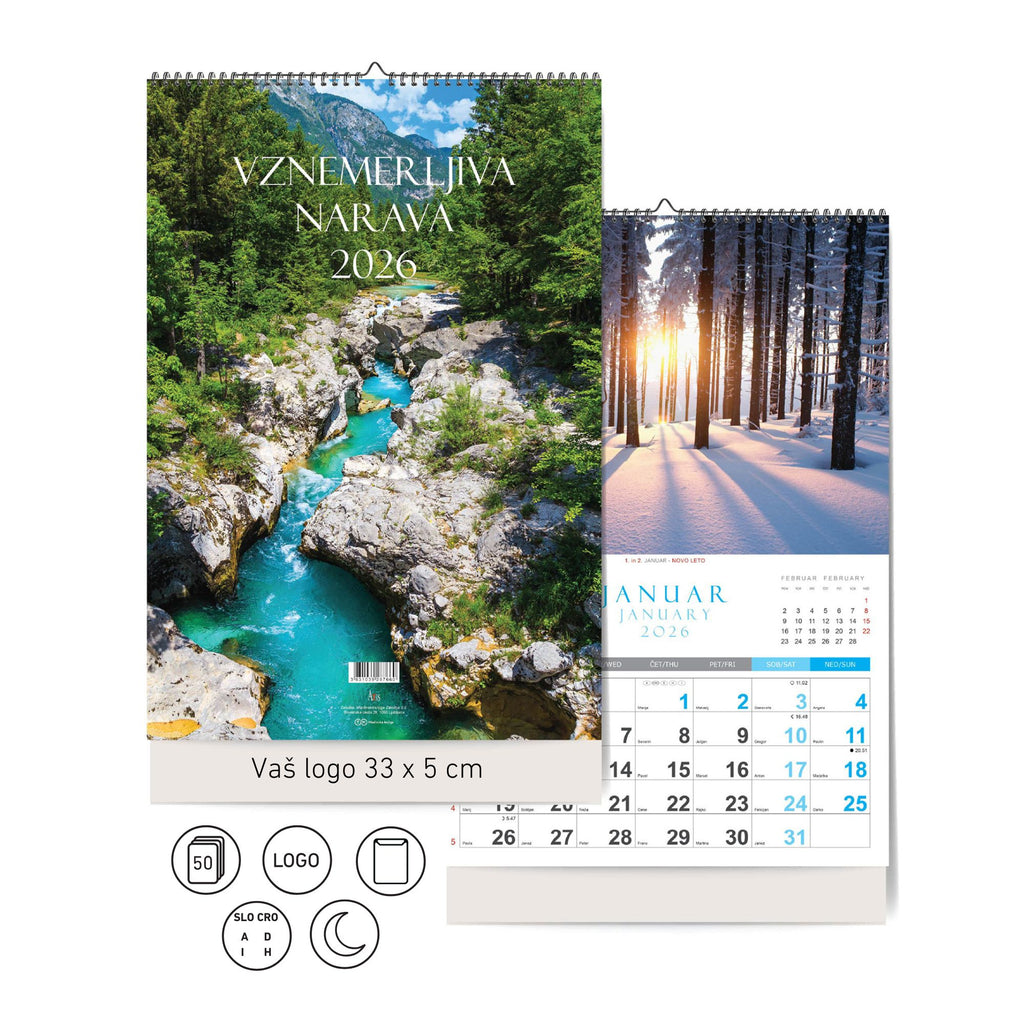 Spiralna vezava, označeni prazniki držav SLO, A, I, CRO, H, D, lunine mene, krstna imena, vložen v vrečko, mogoč natis logotipa na pasico 33 x 5 cm.