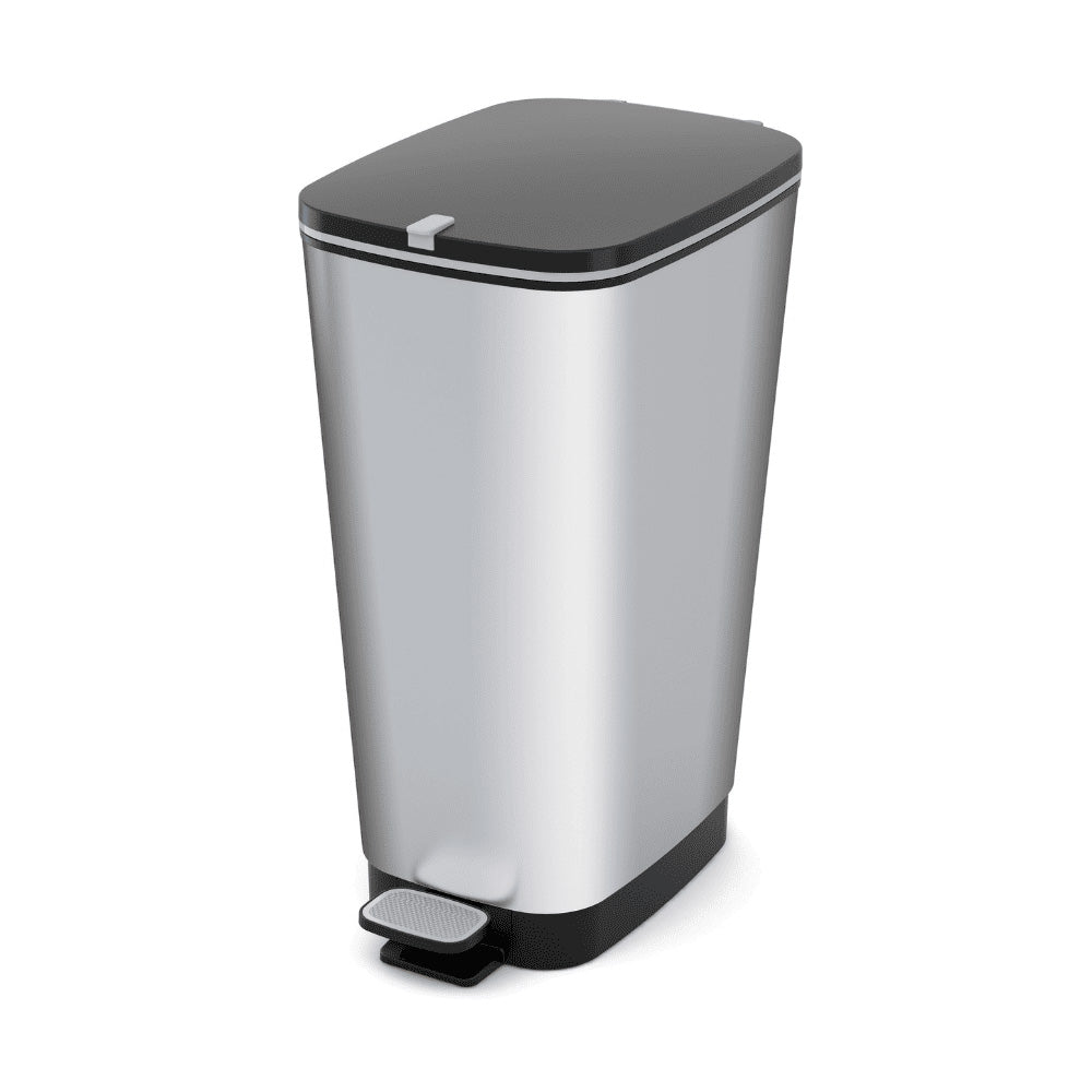 Velik, eleganten koš iz kvalitetnega materiala s odpiranjem na stopalko. Zahvaljujoč gumijastim nogam je koš zelo stabilen, majhen ročaj v pokrovu pa omogoča ročno odpiranje. Gumijasto tesnilo preprečuje uhajanje neprijetnih vonjav iz posode. Metalizirana površina odporna na praske in umazanijo. Dimenzije koša: 44,50 x 29,00 x 60,50 cm.