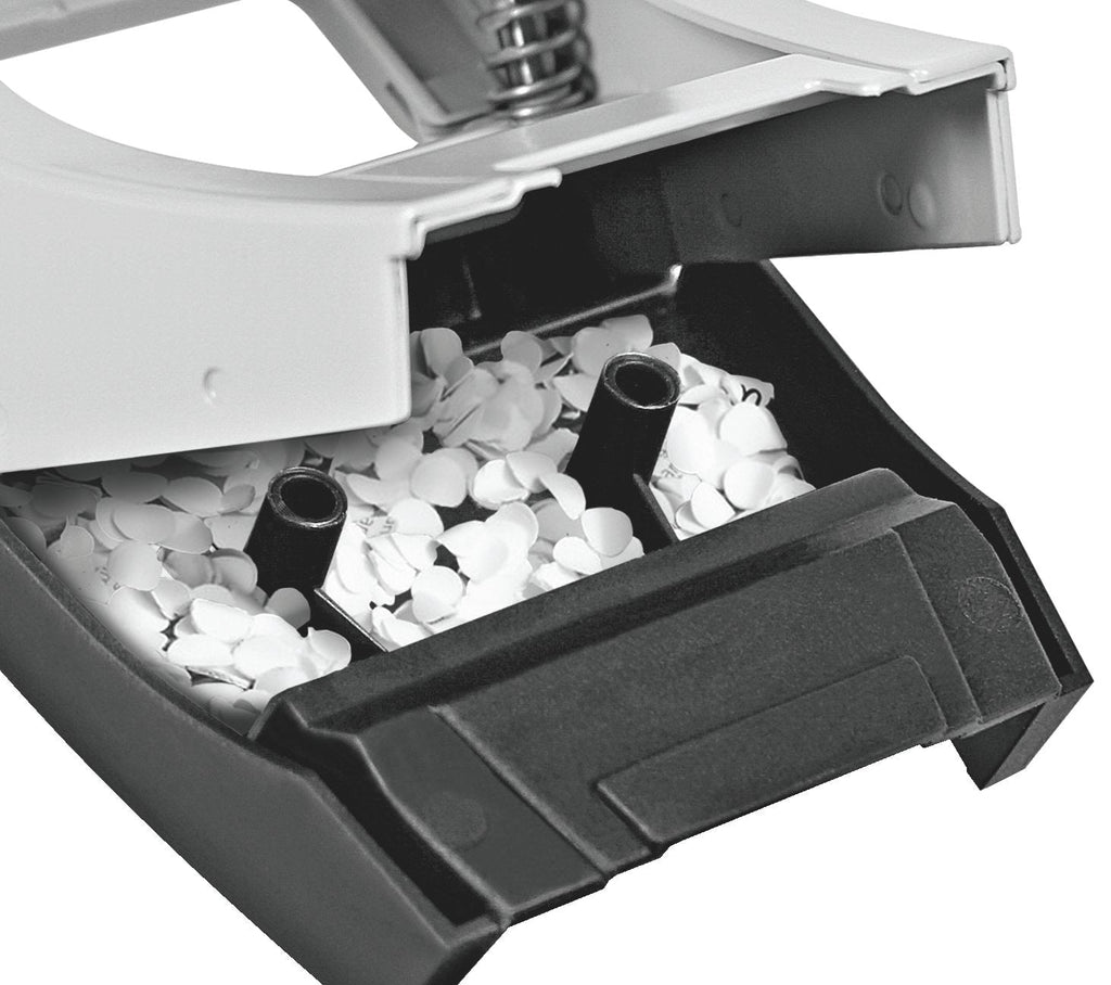 Manjši kovinski luknjač za luknjanje do 16 listov papir 80 g/m2) za vsakdanjo uporabo doma ali v pisarni. Distančnik nam mogoča idealno poravnavo formatov: A4, A5, A6. Posoda za odpadni papir je enostavna za čiščenje. Patentiran ročaj nam omogoča enostavno luknjanje. Razmak med luknjami je 80 mm, premer lukenj je 5,5 mm.