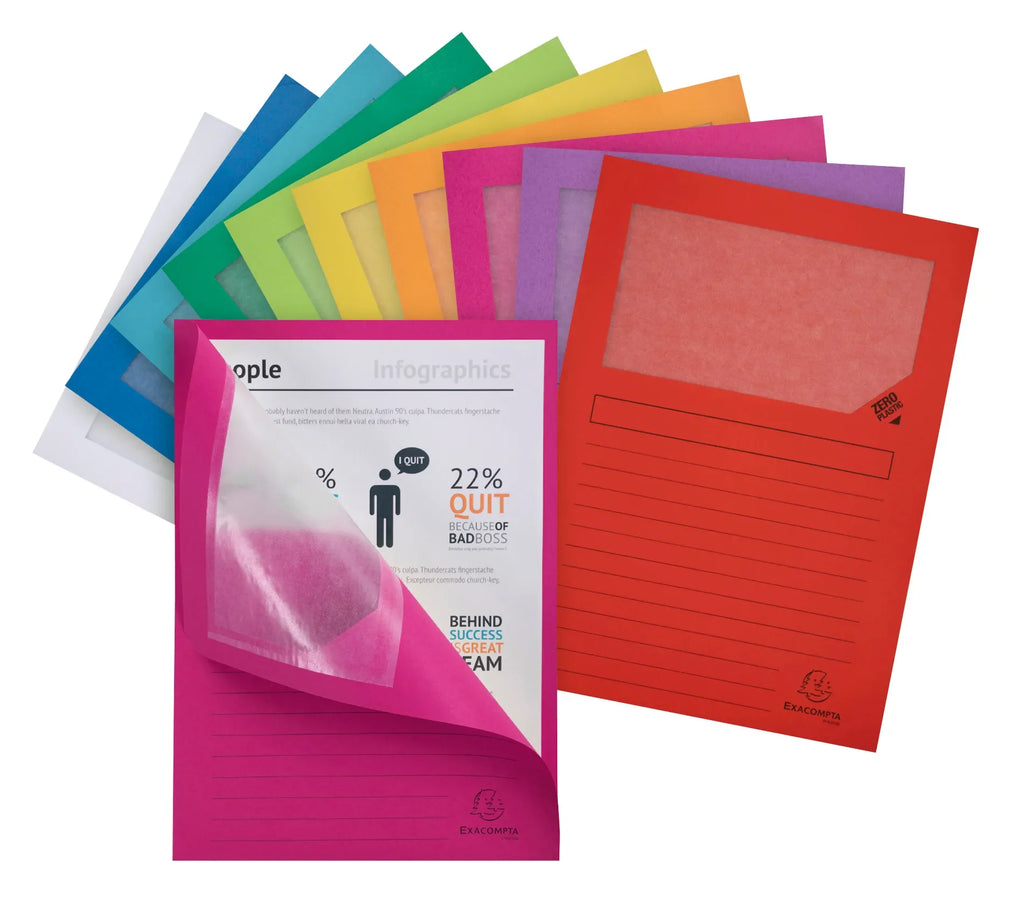 Mapa iz 100% recikliranega 130 g kartona z okencem na sprednji platnici. Zunanje dimenzije: 22 x 31 cm. Na voljo posamezno ali v zavitku 10 map.