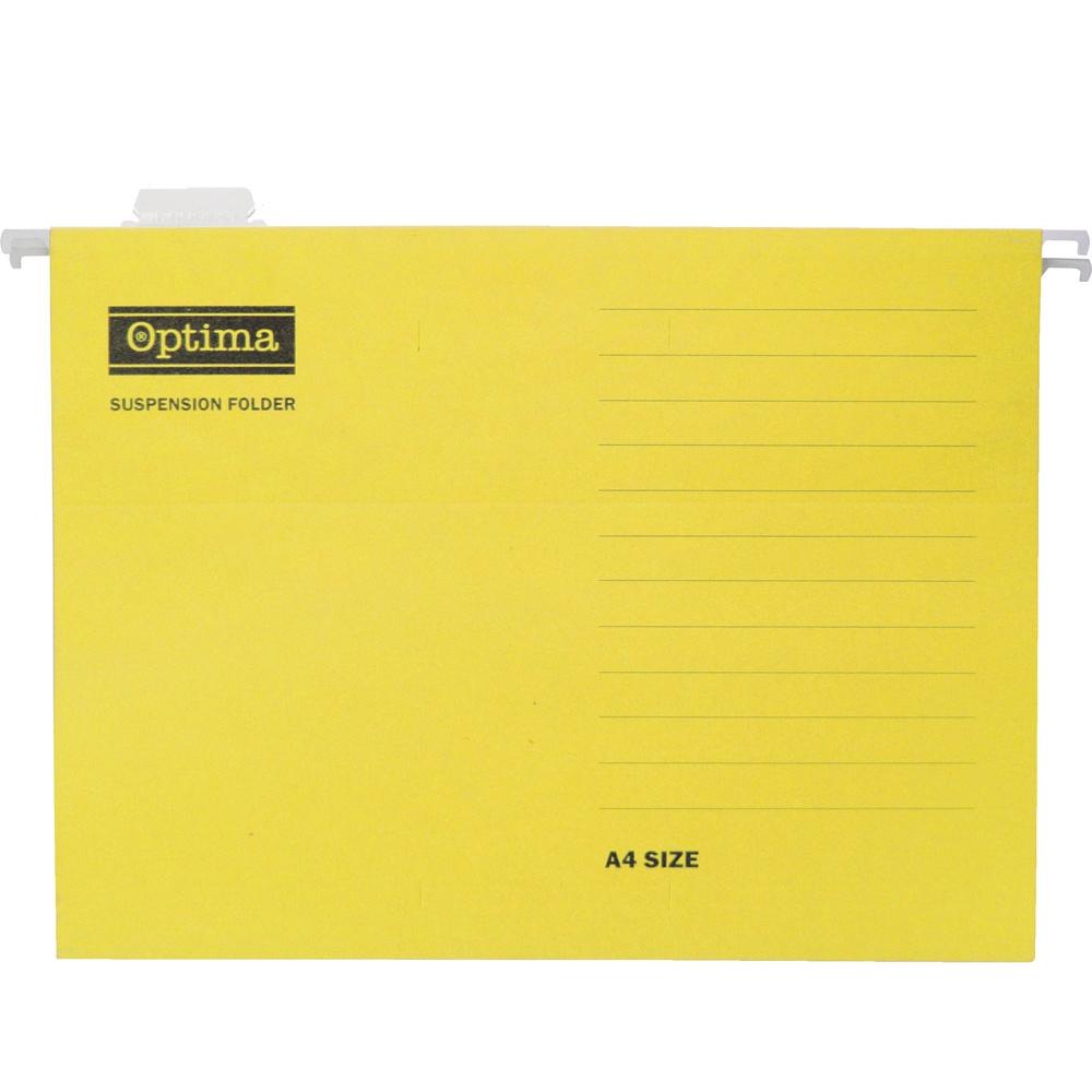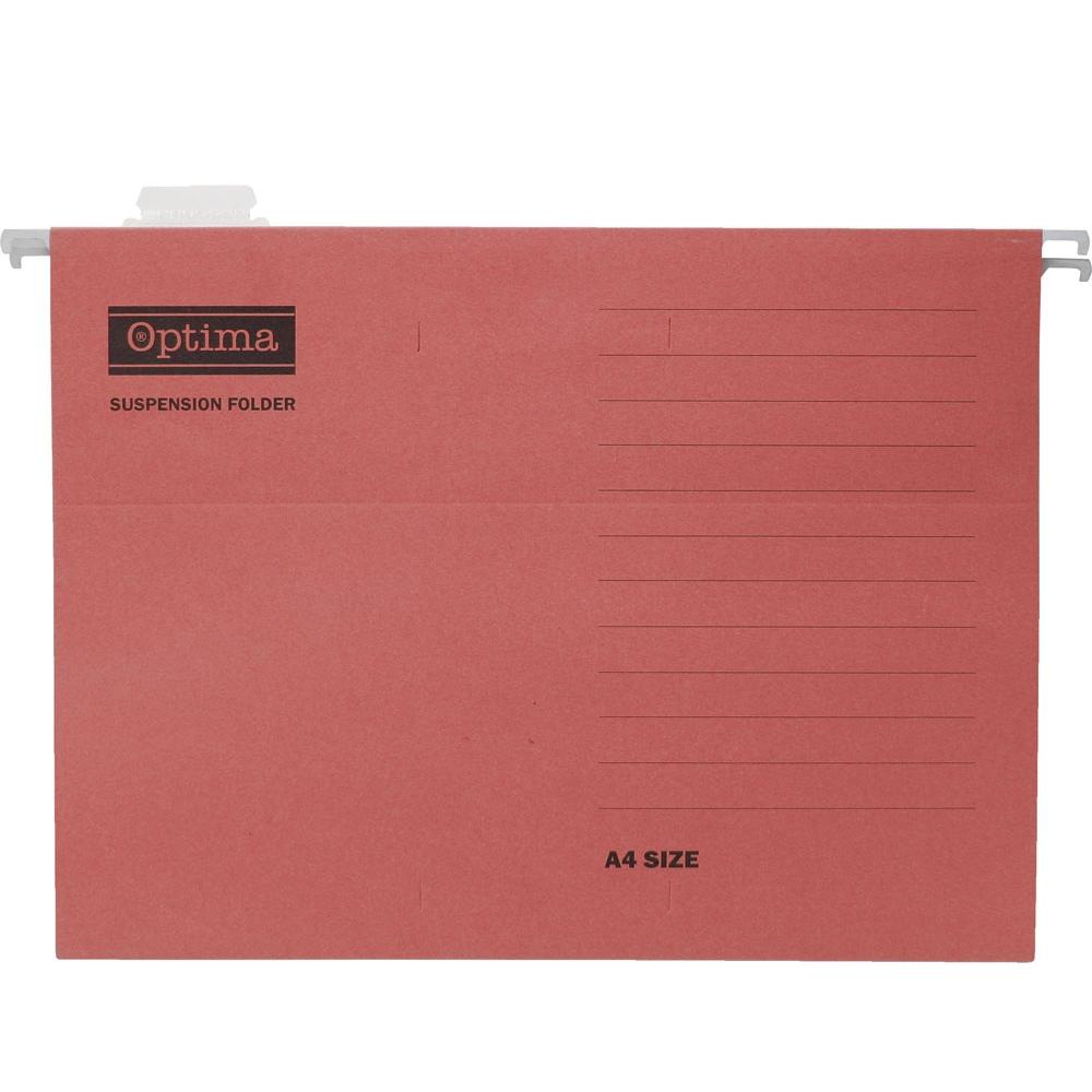 Viseča mapa Optima je velikosti A4 in izdelana iz kartona 180 gramskega papirja oz. kartona. Vsaka mapa je opremljena z jahačem, ki se ga lahko poljubno prestavlja po vsej širini. V zavitku je 25 kosov. Na voljo v različnih barvah.