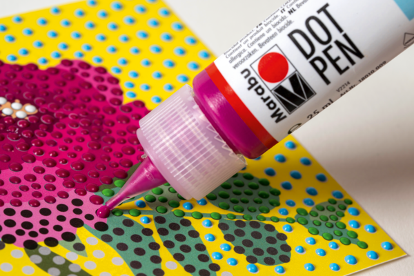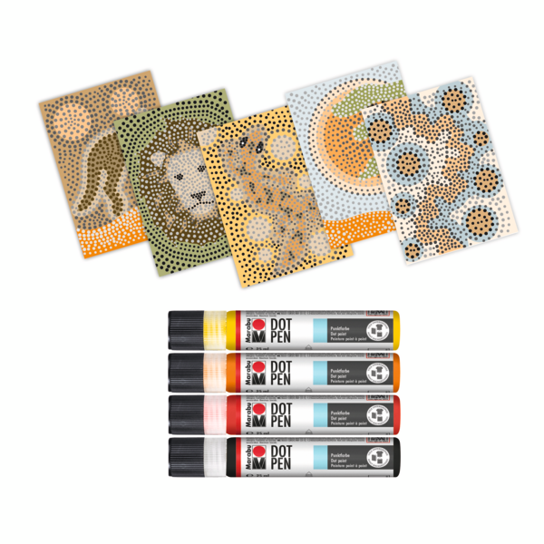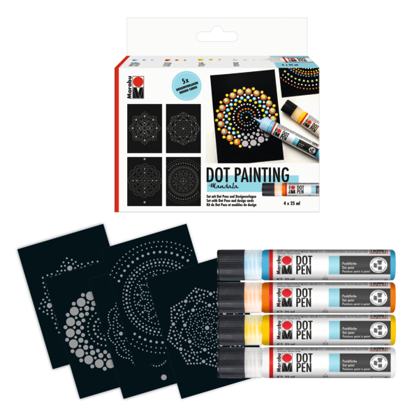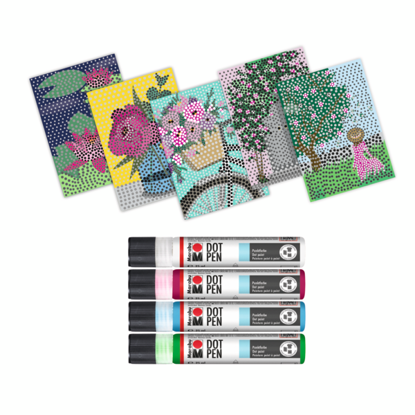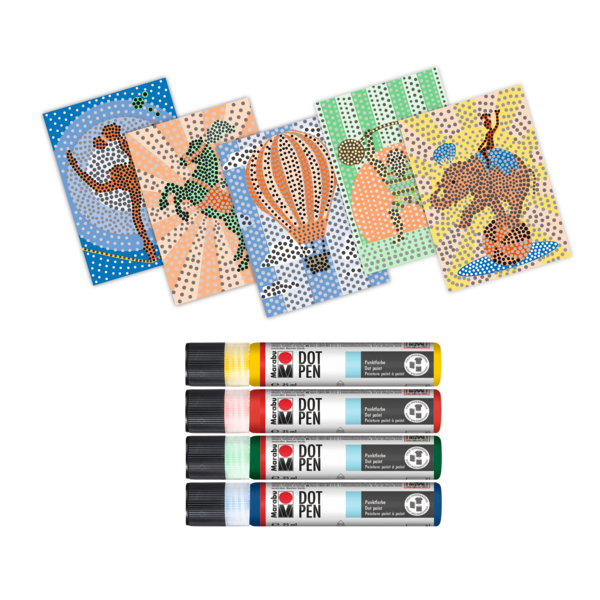 Ustvarite barvita dela s kompletom barv za točkovno slikanje Marabu Dot Pen Set! Komplet vsebuje izbrane barve v obliki linerja, letak in zbirko ekskluzivnih predlog (format razglednice), ki jih lahko poljubno okrasite. Velikost pik bo odvisna od količine nanesene barve.