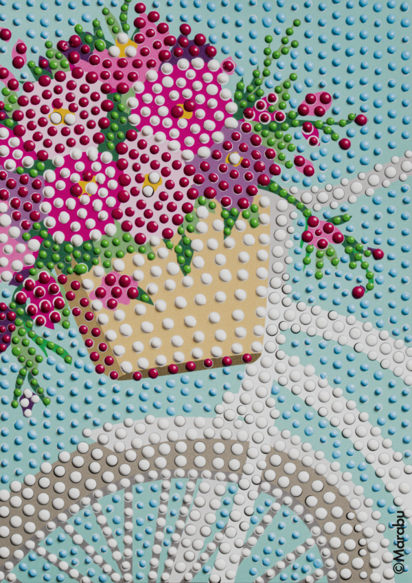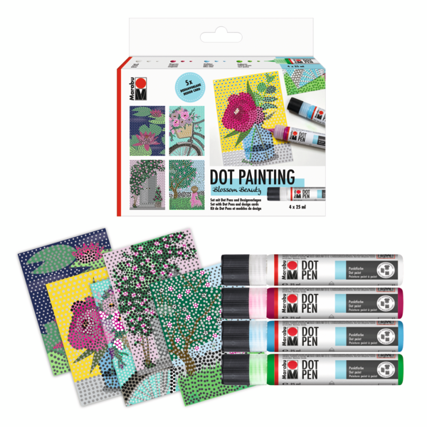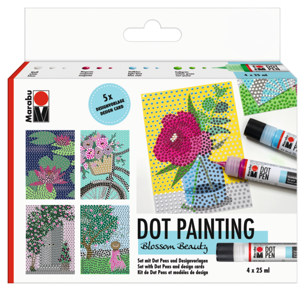 Vsebina seta Beauty: 4 x 25 ml barva v obliki pisala Dot Pen (magenta 014, svetlo modra 090, rumeno zelena 066, bela 070), 5 x A6 cvetlična predloga, 1 x letak.